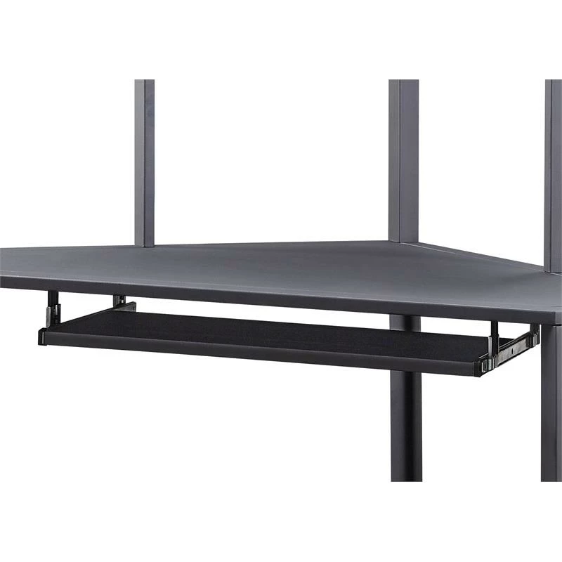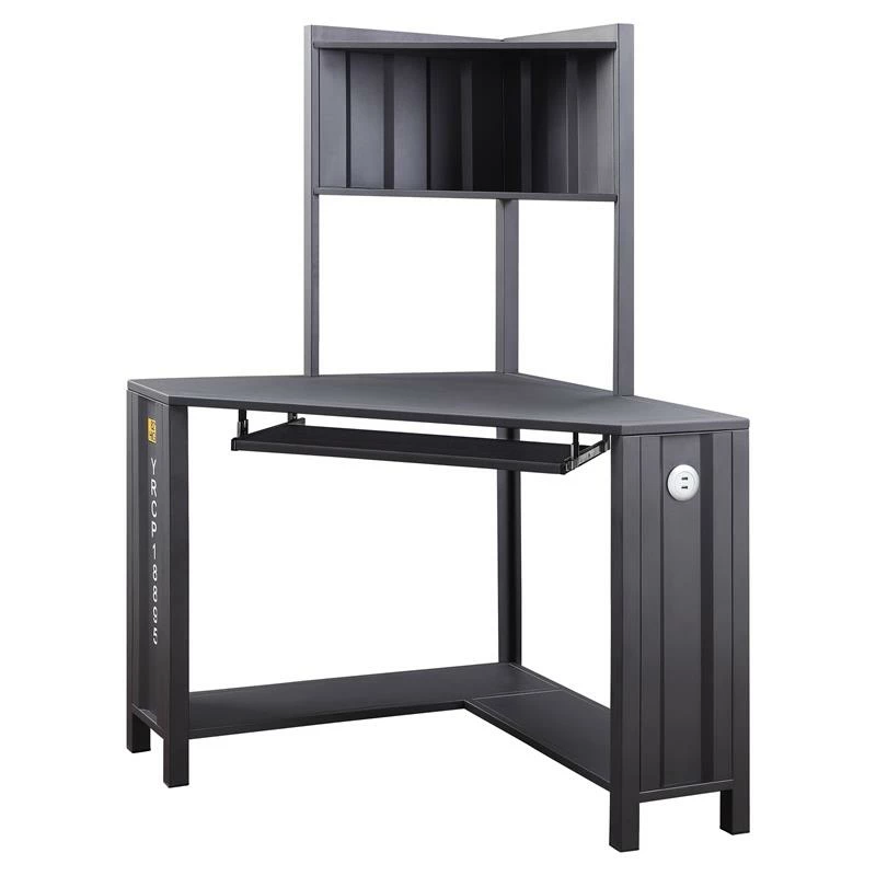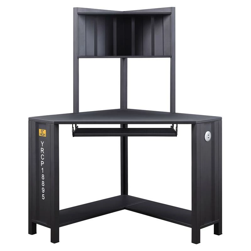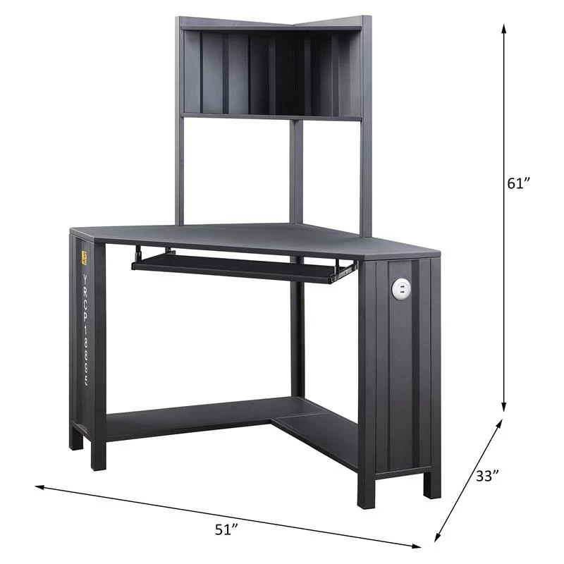 Bold look and rough materials are mixed together to make an instant impact to your space. Combining a true industrial feel with warehouse style, this corner computer desk features a metal frame with freight container look panels. It’s metal frame is design with specific angle to fit any corner in your room and other details include hutch top, bottom shelves, keyboard tray, and USB power dock provide a comfortable working place.