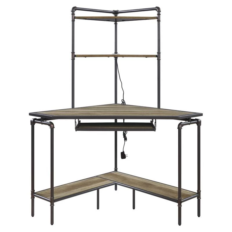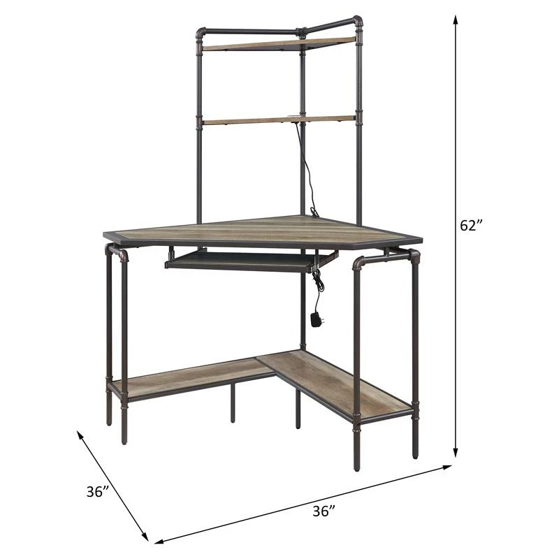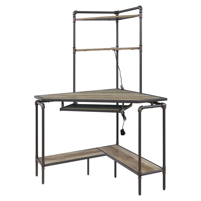 Combing hard-workings materials with netural tone, this industrial-style computer desk will make a bold statement in your workplace. Featuring a metal frame base paird with wooden shelves, this corner desk is very versatile from hutch top, keyboard tray to bottom shlef. There are ample open compartments that allow you to show all your collection, while spacious table top with keyboard is suitable for your computer equipment. Stylish while functional, the Deliz Desk is a perfect addition to your office.
