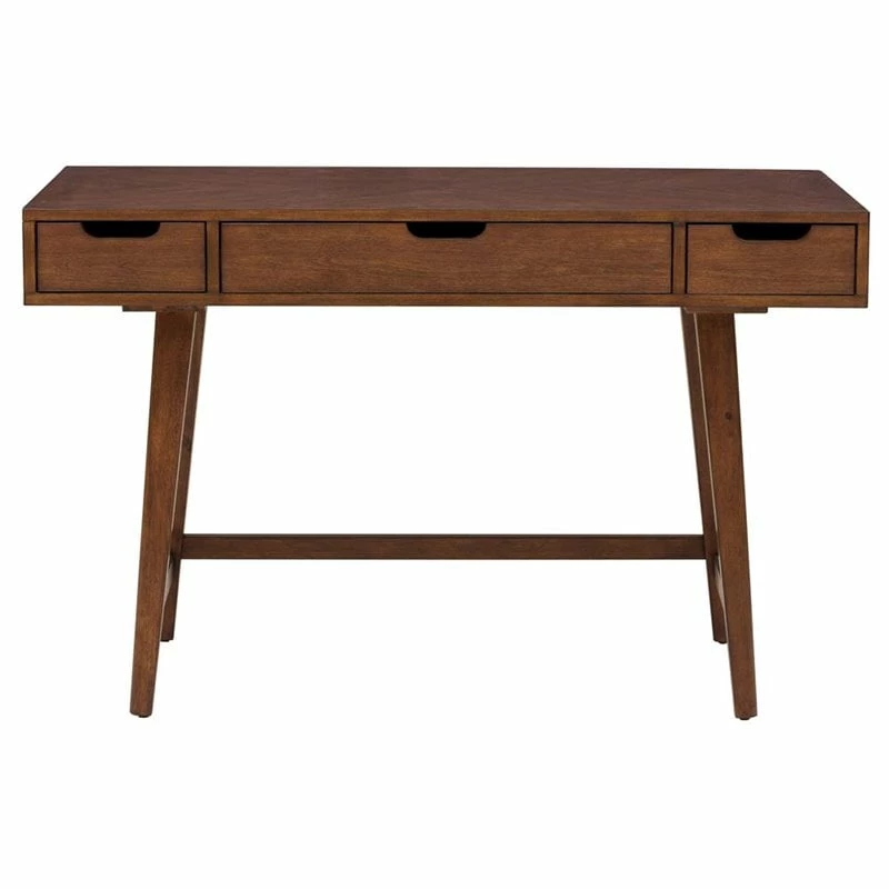 You won’t mind working at this attractive writing desk. Designed in a mid-century modern style, it features square tapered legs, concave drawer pull cut outs, and a light walnut finish. There’s plenty of clean surface space for you to tackle the task at hand, while three drawers provide accessible storage. Easy assembly required.