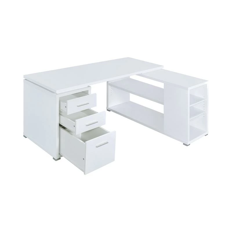 Stylish outlook meets contemporary style in this designer L shape office desk, the perfect place to work in style. Showcasing a clean line design with the sturdy MDF, particleboard and laminate construction, this desk offers ample of storage space for your computer accessories, office supplies, and more with the inclusion of multiple drawers and shelves while its built-in file cabinet is perfect for holding legal size files and to keep your documents secure. It also features a reversible set-up with articulating return for easy mobility and convenience.
