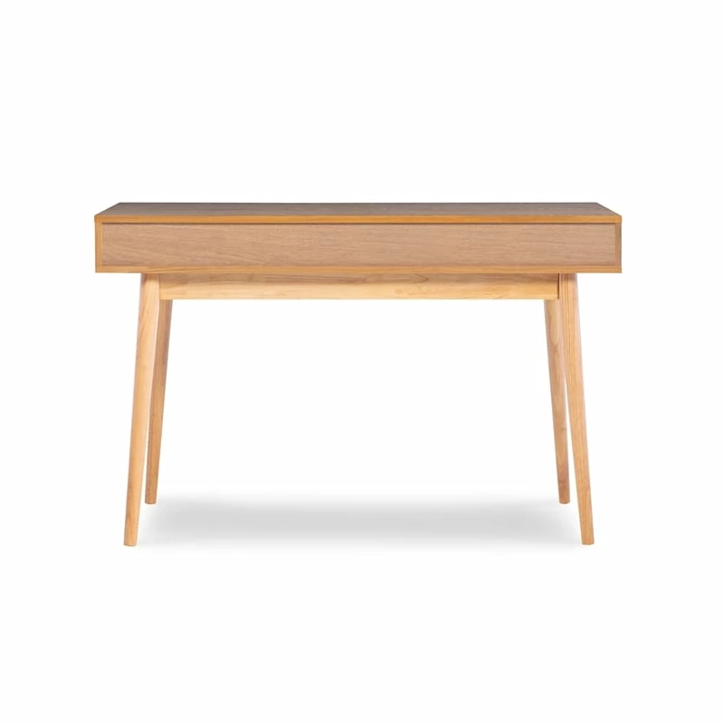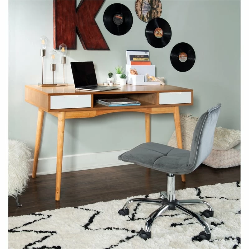 Add contemporary style and work space to your home with this Desk. Two drawers and an open shelf space provide ample storage space for your work essentials. Bright white accents the drawer fronts of the ash veneer framed piece. Round wood legs keep the piece sturdy.