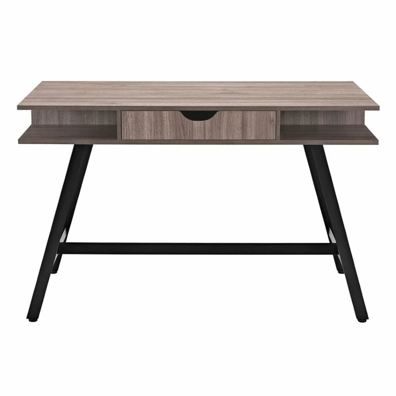 Draw attention to a contemporary writing table that doubles as a study in functionality. This is a dynamic piece which features four open cubby corners and a pull out drawer with a fifth storage area opposite the drawer on the other side. The desk is layered with a natural wood grain patterned melamine finish and is supported by powder coated black steel legs. It is versatile down to the very bottom of the piece with adjustable foot glides that help keep the table level. Whether you plan to sit alone, or with a friend sitting on the other side of you, this desk adds a contemporary style perfect for any contemporary home or office.