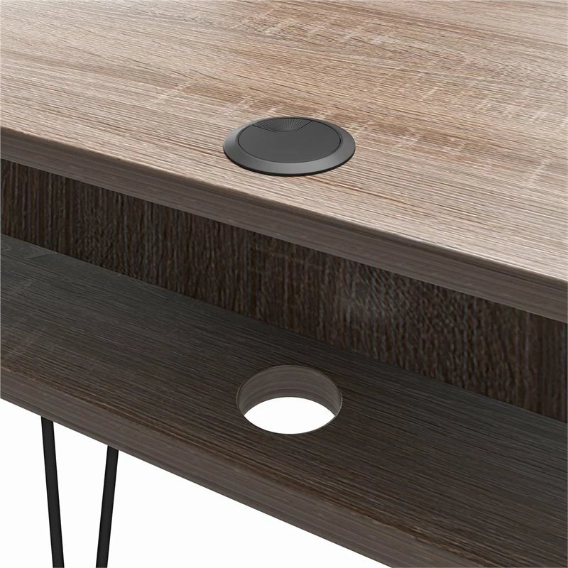Add some mid-century style to your space with the Ameriwood Home Joshua Computer Desk with Storage. This Desk features a medium brown woodgrain finish on the laminated particleboard that pairs with the black powder-coated metal hairpin legs for an elegant, retro style. The minimalistic design makes this Desk a perfect addition to your dorm room or small apartment. The desktop is large enough for you to finish homework or browse social media on your laptop. The 2 open cubbies allows you to store notebooks, writing utensils, and papers off of the desktop but still within reach to keep your workspace clutter free. The back of the desk features a long open cubby that is perfect for hiding a power strip. A wire grommet keeps your cords organized and tangle free. The top of the Desk comes preassembled to make assembly quick and easy by simply attaching the 4 legs. The Desk ships flat to your door and minimal assembly is required. Once assembled, the Desk measures to be 30.4”H x 40.5”W x 21.65”D.