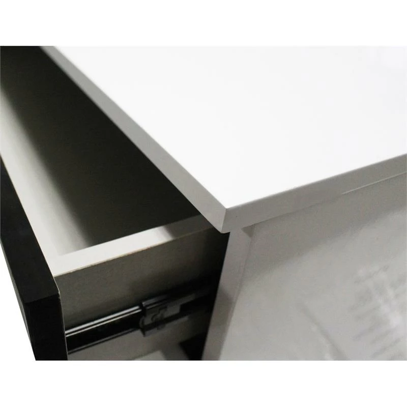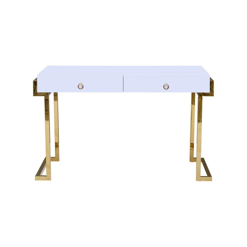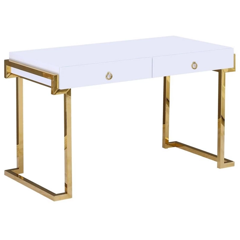 If you love the white shiny modern style, this clean and sleek computer desk will provide the look you want. Made of poplar wood, Engineered Wood, lacquer and covered in high gloss. The legs are made of stainless steel and the table comes with 2 drawers with metal side rails. The table has a smooth shiny finish and comes with pull ring handles.