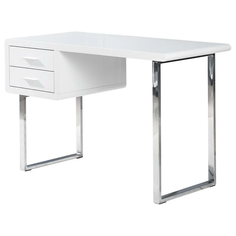 This sleek modern white computer desk is perfect for studying and writing. The desk comes with 2 drawers with slide metal rails for extra storage, high gloss and stainless steel legs. Its simple and perfect for any bedroom and or studio.