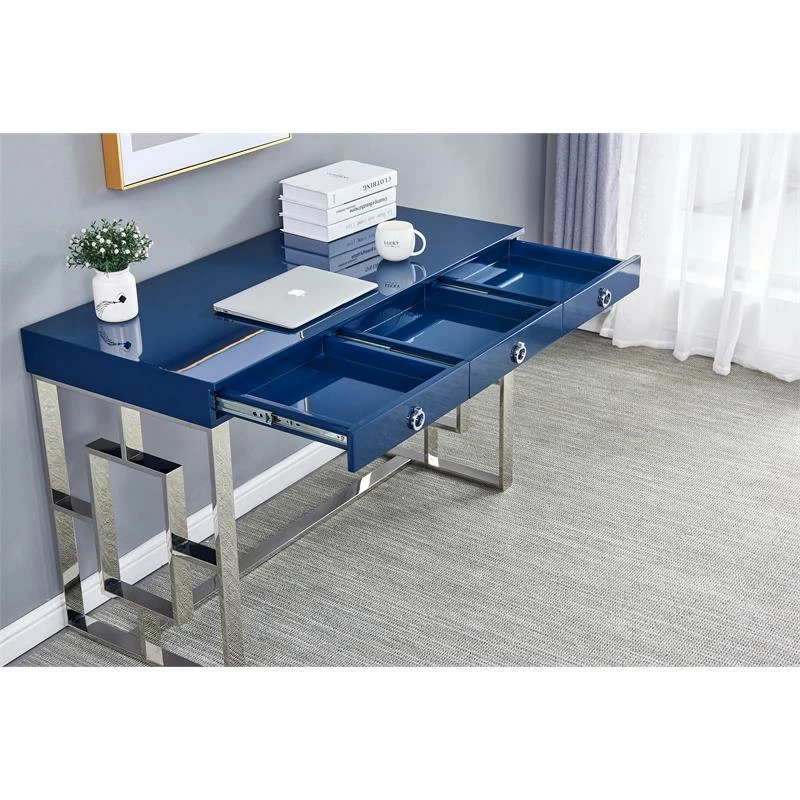 Add a contemporary look to your home or office with this blue writing desk. This desk features 3-drawers for storage and stainless steel legs. The desk top is made of poplar wood, mdf, lacquer and covered in high gloss. The desk also comes with ring handles, same color as the base to give it a special detailed look.