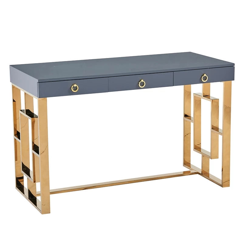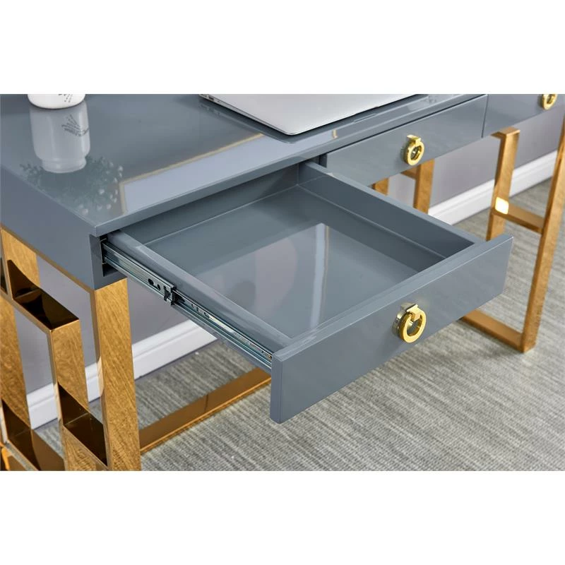 Add a contemporary look to your home or office with this writing desk. This gray desk features 3-drawers for storage and stainless steel legs. The desk top is made of poplar wood, mdf, lacquer and covered in high gloss. The desk also comes with ring handles, same color as the base to give it a special detailed look.