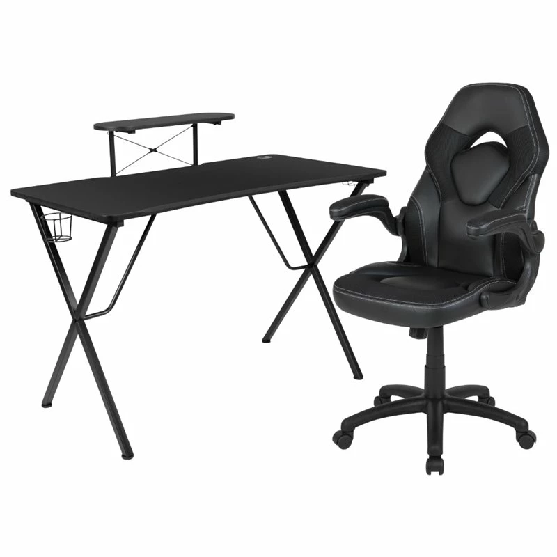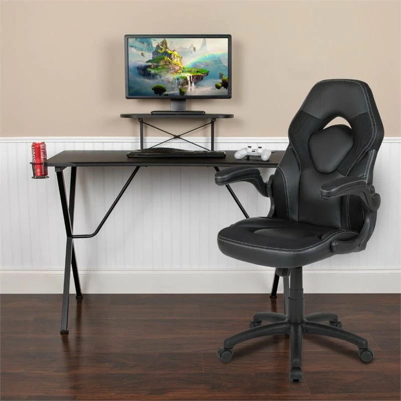 Let the games begin on this gaming desk and chair set. Not only cool to look at but the raised platform keeps your PC monitor at eye level, reducing neck strain. The black top gamers table has a grommet for cable management, a detachable cup holder and headset holder to keep you in game mode. The racing game chair have flip-up arms to comfortably rest your arms on while handling the controller or flip-up to slide under the desk. Be true to the gaming experience with a desk and chair combo designed for gaming systems. If you need more desk space, remove the platform to accommodate dual monitors. Use the cup holder to prevent beverages from spilling on your pc gaming keyboard. The comfortably padded ergonomic gaming chair has a full swivel cylinder and adjusts with the pneumatic lever. Tilt back with ease by pulling the lever outward, control the force needed to recline by turning the knob underneath the seat. Made for gamers, this gaming desk and chair bundle will get you on your way to leveling up.