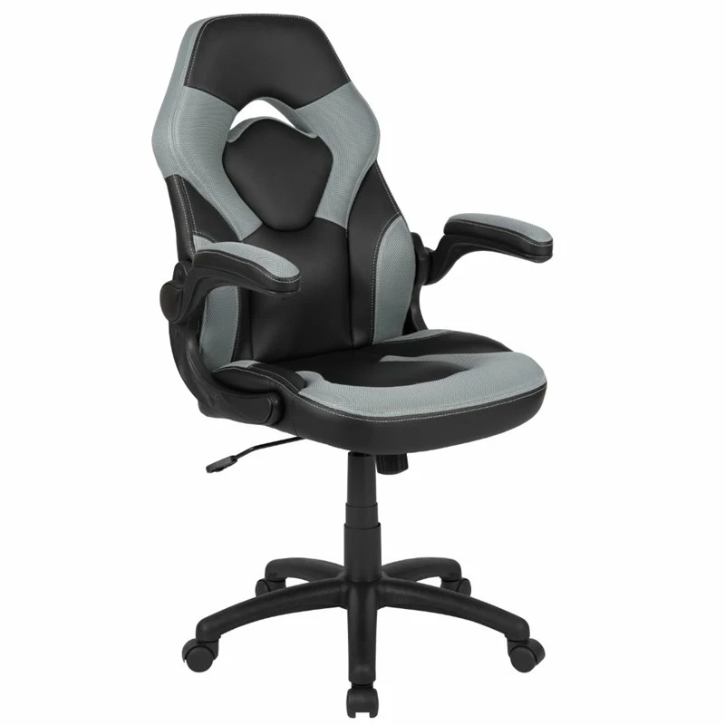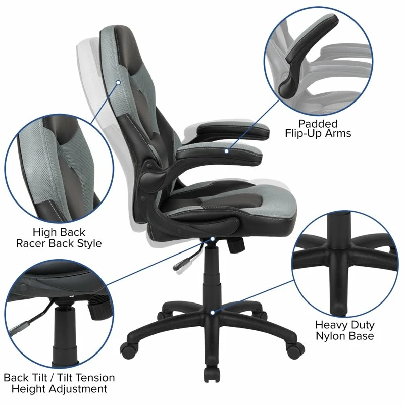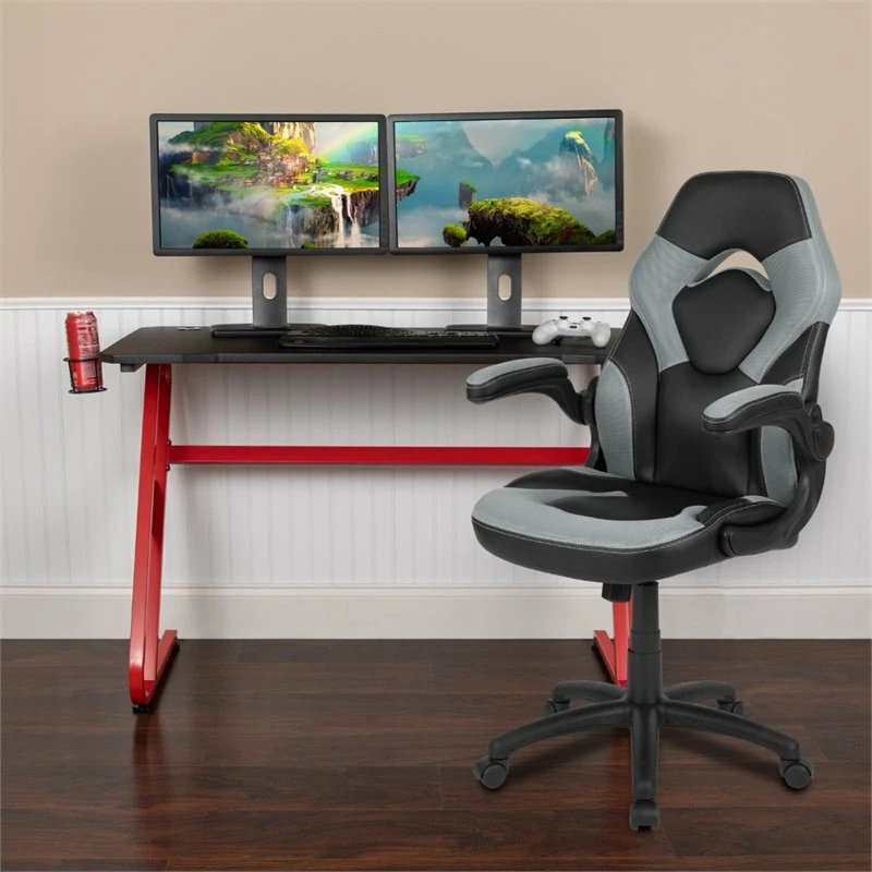 Let the games begin on this gaming desk and chair set. A sleek, red z-frame offers stability and style for a cool looking desk setup. The black top gamers table has two grommets for cable management, a detachable cup holder and headset holder to keep you in game mode. The racing game chair have flip-up arms to comfortably rest your arms on while handling the controller or flip-up to slide under the desk. Be true to the gaming experience with a desk and chair combo designed for gaming systems. A spacious desktop that can hold up to 2 monitors adds more excitement to the game. Use the cup holder to prevent beverages from spilling on your pc gaming keyboard. The comfortably padded ergonomic gaming chair has a full swivel cylinder and adjusts with the pneumatic lever. Tilt back with ease by pulling the lever outward, control the force needed to recline by turning the knob underneath the seat. Made for gamers, this gaming desk and chair bundle will get you on your way to leveling up.