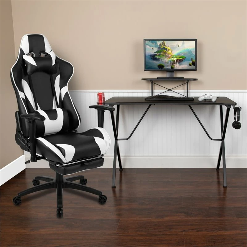 You’re going to enjoy playing on this high-performance racing gaming chair with slide-out footrest. This modern gaming chair is paired with an ergonomic gaming desk that has a raised platform to reduce neck strain. If you sit for hours in an office chair you need a gaming chair that is comfortable, and this chair includes adjustable and removable headrest and lumbar pillows. For maximum support this office chair with footrest engages by pulling the loop then flipping the footrest up to elevate your feet and has a separate lever to recline the back 87° ~ 145°. Upgrade your gaming furniture with this desk and chair bundle that offers the perfect combination at an unbeatable price. The black top gamers table can hold up to two monitors and has two grommets for cable management. Always know where your headset is with the included headrest hook while you keep your desktop and pc gaming keyboard clear of accidental spills by placing hot and cold beverages in the cup holder. Your online followers will know that you’re serious when they see you in your reclining gaming chair with footrest.