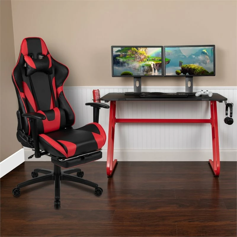 You’re going to enjoy playing on this high-performance racing gaming chair with slide-out footrest. This modern gaming chair is paired with an equally modern red-z-framed gaming desk to get in all your essential playtime. If you sit for hours in an office chair you need a gaming chair that is comfortable, and this chair includes adjustable and removable headrest and lumbar pillows. For maximum support this office chair with footrest engages by pulling the loop then flipping the footrest up to elevate your feet and has a separate lever to recline the back 87° ~ 145°. Upgrade your gaming furniture with this desk and chair bundle that offers the perfect combination at an unbeatable price. The black top gamers table can hold up to two monitors and has two grommets for cable management. Always know where your headset is with the included headrest hook while you keep your desktop and pc gaming keyboard clear of accidental spills by placing hot and cold beverages in the cup holder. Your online followers will know that you’re serious when they see you in your reclining gaming chair with footrest.