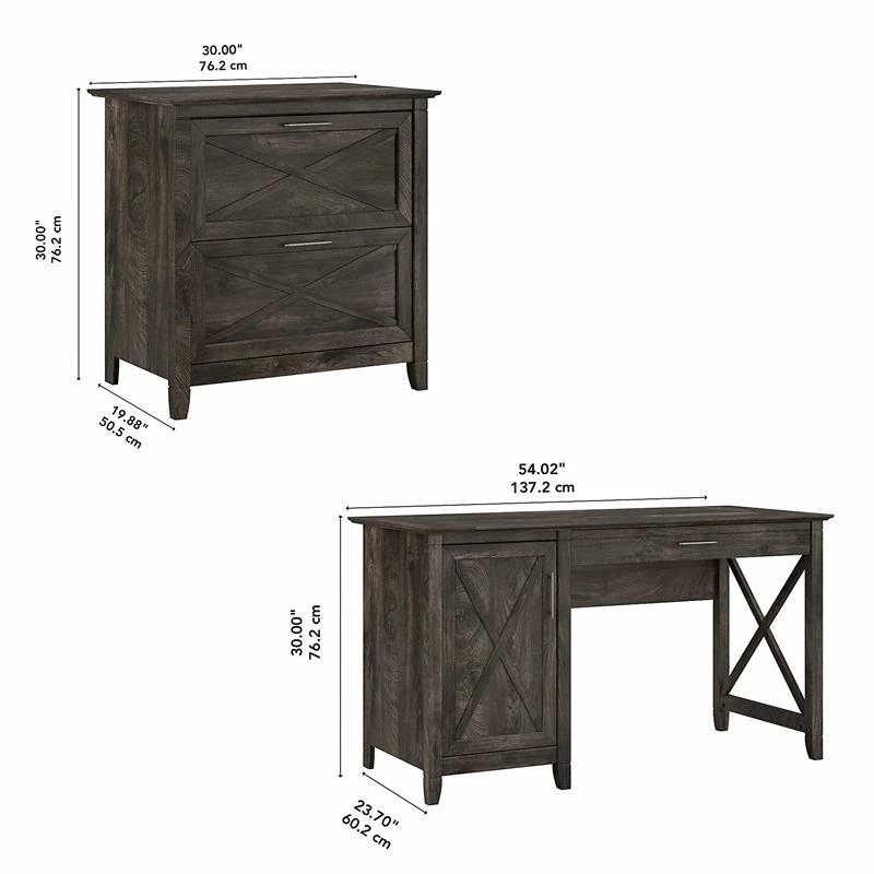 The Bush Furniture Key West 54W Computer Desk with 2 Drawer Lateral File Cabinet offers a refreshing approach to working in your home. Spread out with a computer, books and paperwork on a durable 54W x 24D desktop that boasts a weight capacity of 200 pounds. The convenient top drawer is an ideal place to store your keyboard or laptop and has a flip down front that folds up neatly when not in use. The Desk also includes a built-in storage cabinet with one adjustable shelf to accommodate materials of various sizes. The lateral filing cabinet’s drawers open on smooth full-extension ball bearing slides for an easy reach to legal and letter size documents. Unique X pattern accents create a relaxed feel with a sturdy and attractive post leg design. This office desk with drawers set is tested to meet ANSI/SOHO quality standards for safety and performance and is backed by a 1 Year Warranty. Materials: Engineered wood and Laminates
