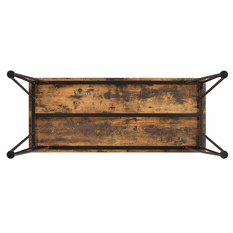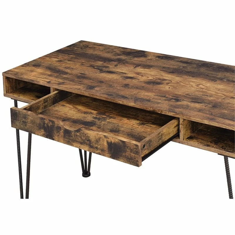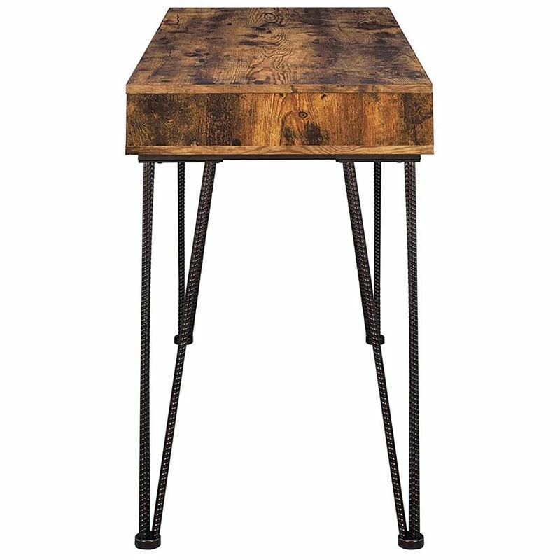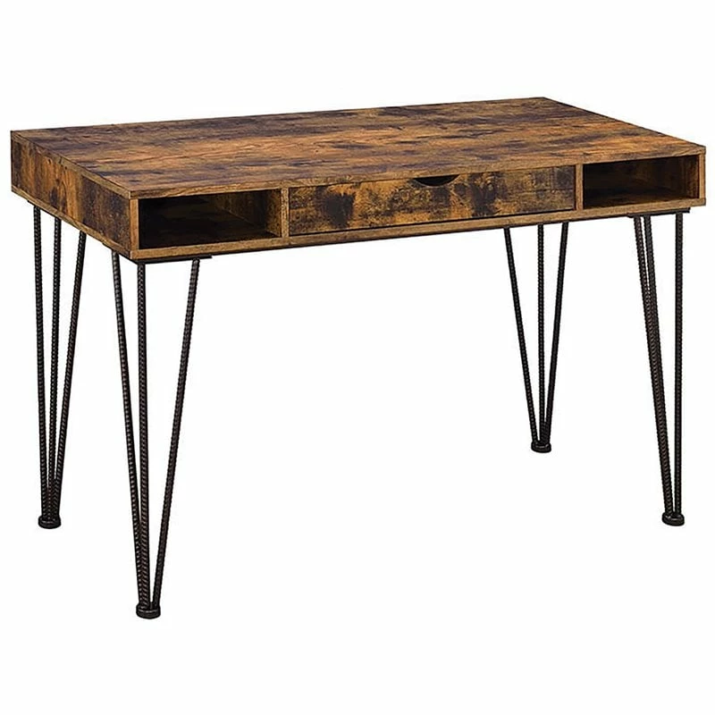 This elegant industrial style writing desk is a splendid addition the home or commercial office. It features open storage compartments on either side and a center drawer with euro glides. It’s built with steel, particle board, and engineered veneer for reliable durability. The desktop easily accommodates a laptop and notebooks as well as a small table lamp. It’s handsomely finished in antique nutmeg with solid metal rebar legs that are finished in dark bronze for a rich appeal and warm ambiance.
