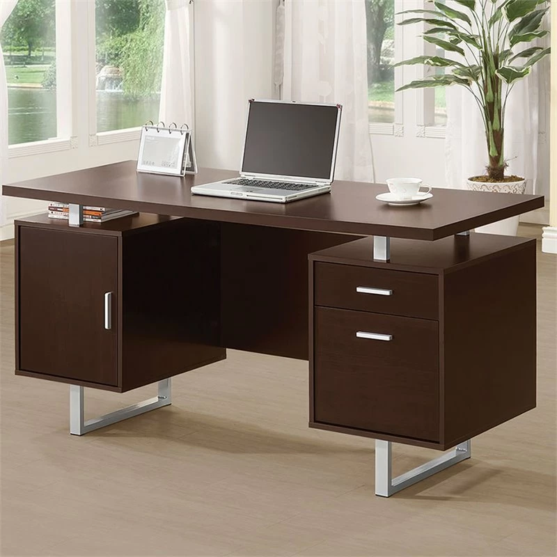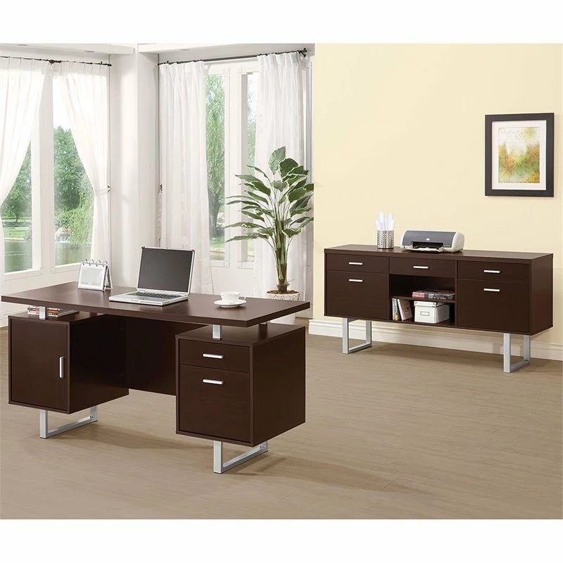 Enjoy an intriguing architectural design in this office desk. A floating top creates a visually enticing effect and a completely different look. Finished in deep cappuccino, it flatters surrounding décor and delivers a dramatic touch. Store essentials in a cabinet and drawer, and use a file cabinet to organize papers. Contrasting silver hardware and steel legs play up the contemporary flavor of this stylish desk.