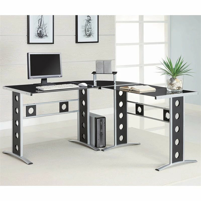 With a bold, contemporary design, this three-piece computer desk set amplifies the style of a home office or library. Finishes of black and silver pleasingly complement each other for a funky, modern aesthetic. Its L-shape tucks neatly into a corner to help you save space. A clear, tempered glass top adds sturdiness and shine, while a small corner shelf offers maximum functionality. Constructed from steel, MDF, and engineered veneer, this desk is a durable and stylish addition to any modern home.