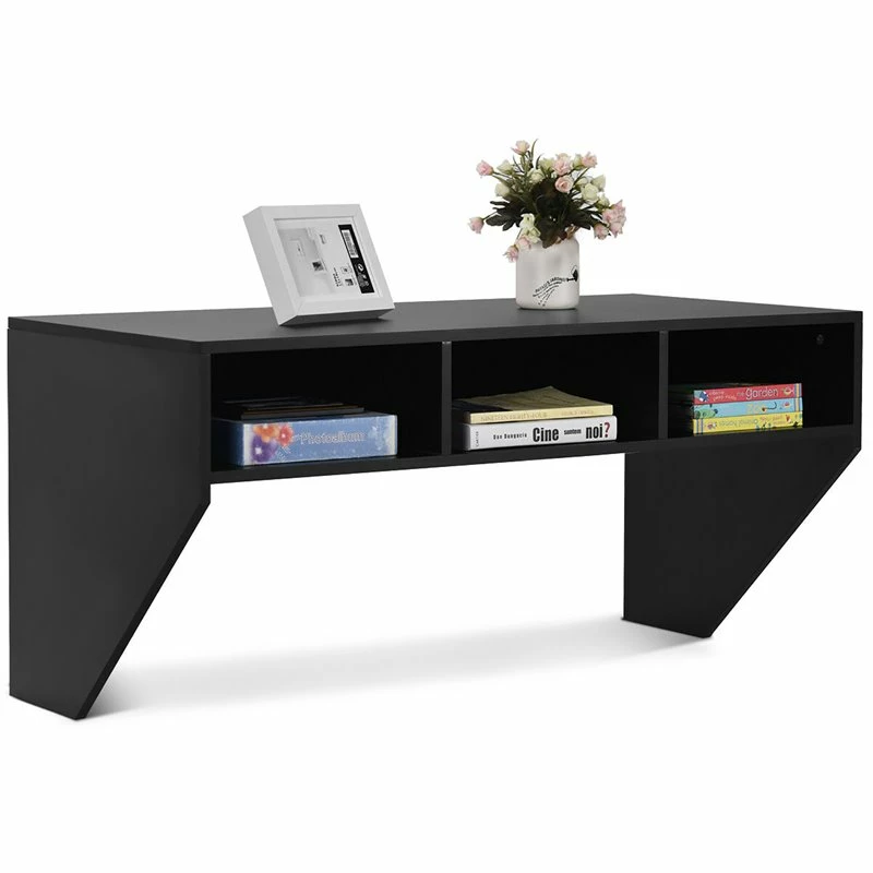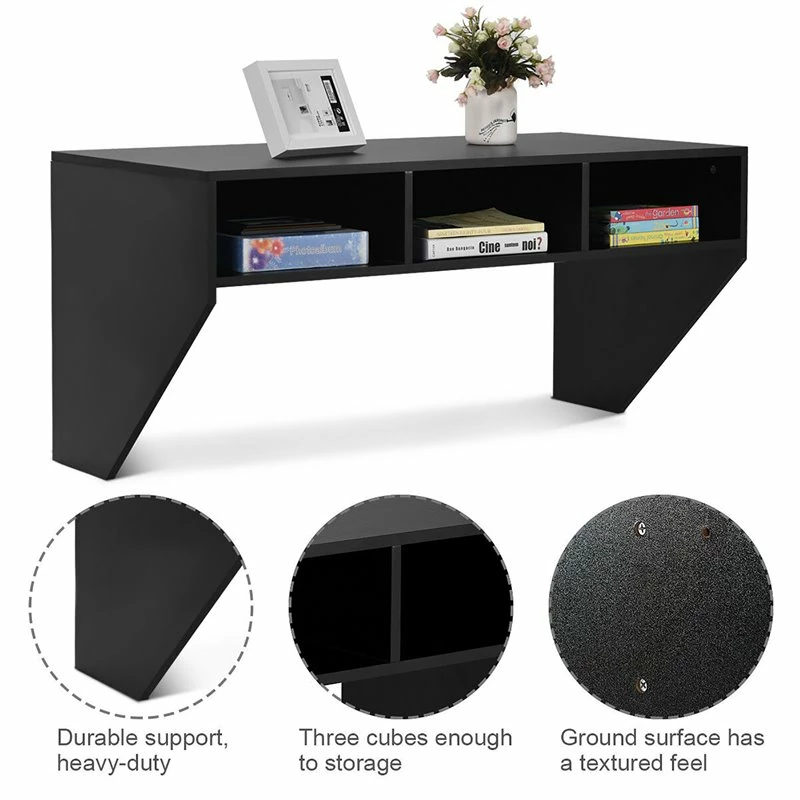 Costway Wall Mounted Floating Computer Desk: Wall mounted work desk that provides more space in a room in a contemporary style, which suit for your office, study, bedroom or living. Enough Storage Space: Three compartments below desktop offer space for books, laptop and accessories. 20 inch deep of desk provide enough space for your working or study. Sturdy & Durable: Made of MDF and the high quality wood construction gives this desk a sleek design and a durable frame. 44lbs weight capacity are suitable for daily use. Convenient Use: Mount at any height with Prepac’s metal hanging rail system. A minimalist look, compact cabinet suit for office, sturdy, bedroom or living room. Easy Assemble: Black painted surface are easy for daily clean. Easy assemble required with all hardware packed in the package.