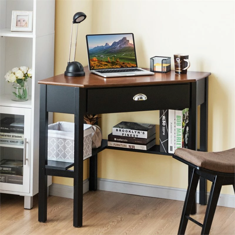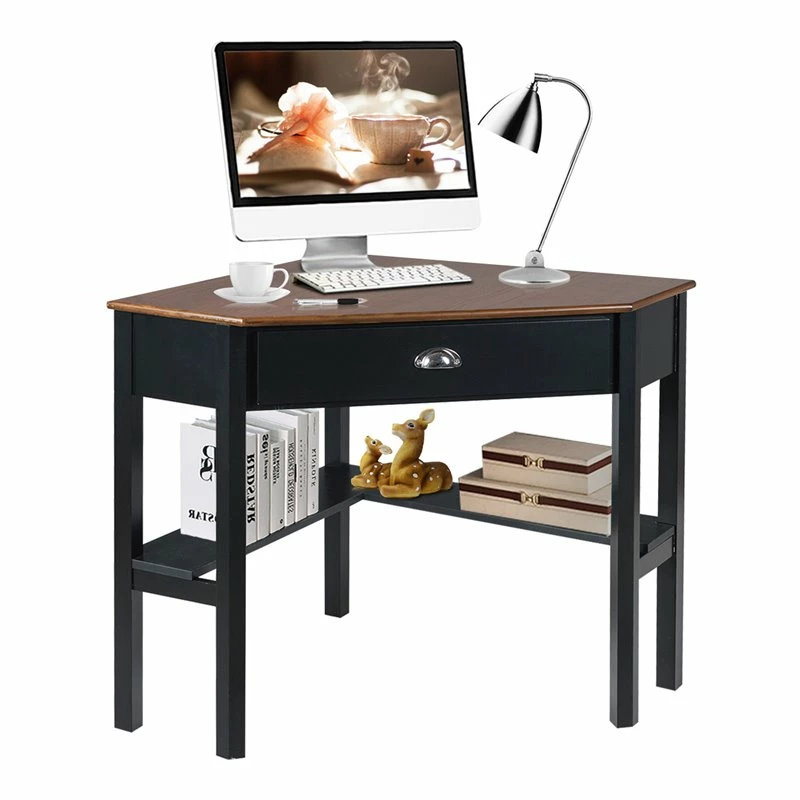 This is our corner computer desk, which is a perfect furniture for small living space and provides you with a unmatched convenience. The space-saving corner design make it fit to any room. With solid wood construction, this computer desk provides years of sturdy and reliable use. It features a large slide-out drawer, allowing you to keep your supplies organized. Bottom book shelves provides more storage space for its user. Add it t your cart now!