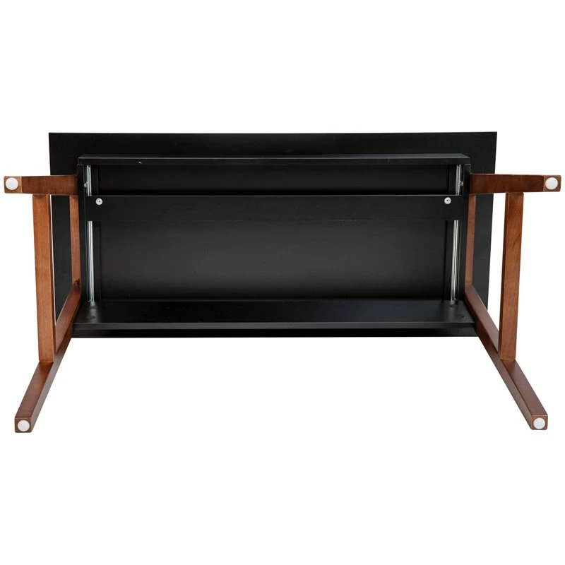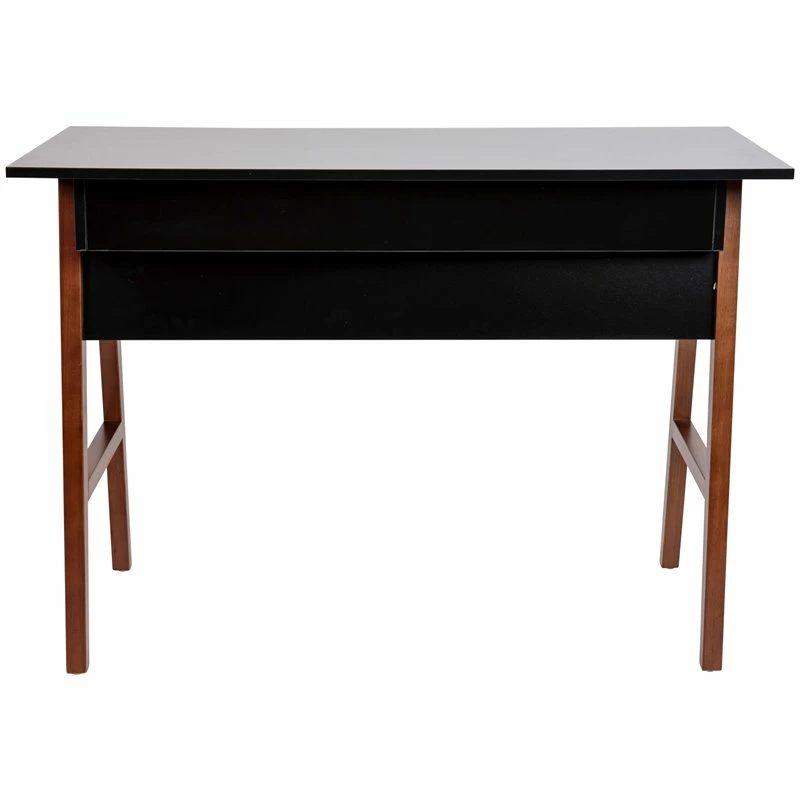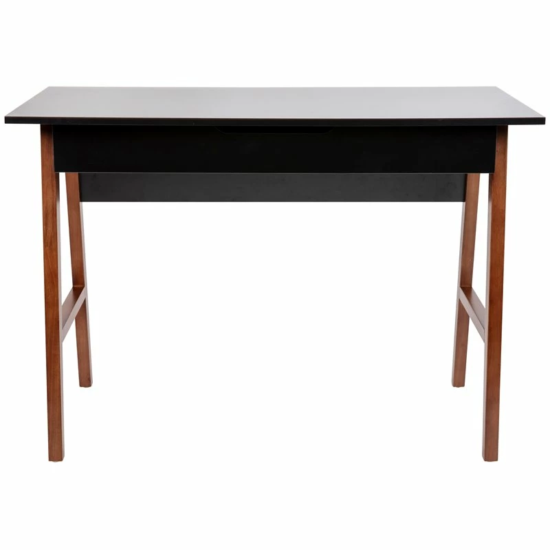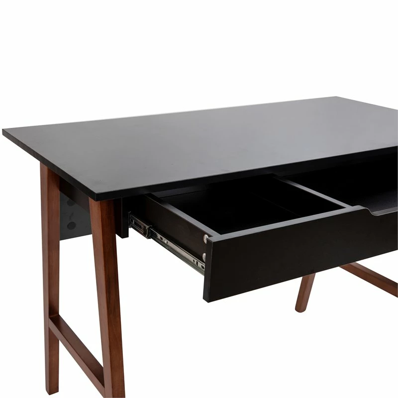 If you’re now working from home, a full time student, or an aspiring writer it’s important to have a space you enjoy spending time in. Create a comfortable and stylish place to spend your working or creative hours with this two-tone writing computer desk with storage drawer. The smooth rectangular laminate top provides ample room for your desktop or laptop computer and boasts a black finish that pairs beautifully with the walnut A-frame legs. This home office desk features a partitioned drawer to hold important papers on one side and office accessories on the other. Ball bearing drawer slides allow whisper-quiet opening and closing. Quality construction and superior materials make up this wood writing desk. The strong and durable frame is made from rubberwood that is part of the maple family and is capable of holding up to 200 pounds static weight capacity. The laminate top protects against chips and scratches and is easily cleaned with a water based cleaner. This versatile desk will make a lovely vanity desk as an influencer with plenty of room to display items on the expansive top and store cosmetics in the divided storage drawer. The integrated floor glides protect floor surfaces when you need a change of scenery in another room. With a medium assembly level, you can have your new desk up and ready to decorate in under 45 minutes. Place this writing desk with drawer in your home office, dorm room or in your small apartment for a one-of-a-kind workspace that will look great for years to come. [GC-MBLK60-BK-WAL-GG]