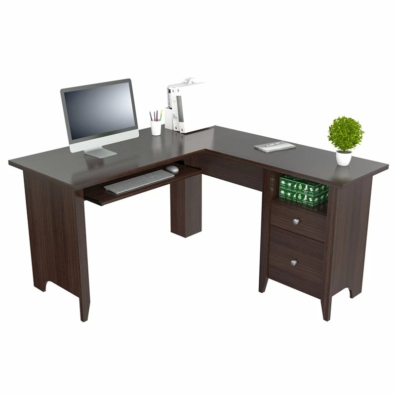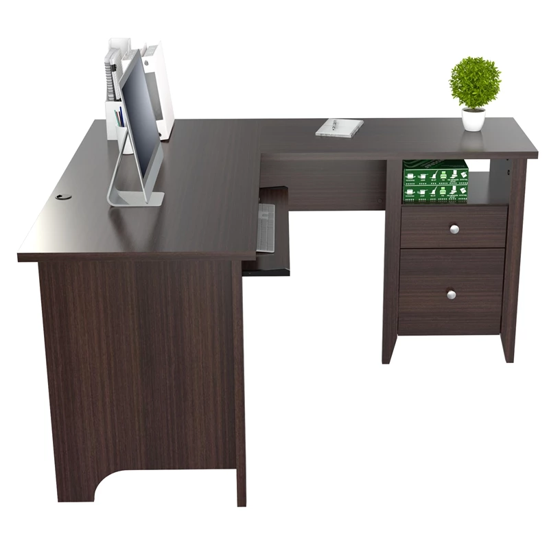 L Shaped Computer Desk by Inval America finished in a rich “Espresso” laminates in durable melamine which is stain, heat and scratch resistant. The L-shape of this desk delivers sufficient space for your monitor, laptop, tablet, etc. while still providing ample work space. The bottom drawer can accommodate letter sized file folders for easy access while the smaller top drawer houses your office supplies. The open cubby is useful for keeping daily used items readily available. Constructed from manufactured wood.