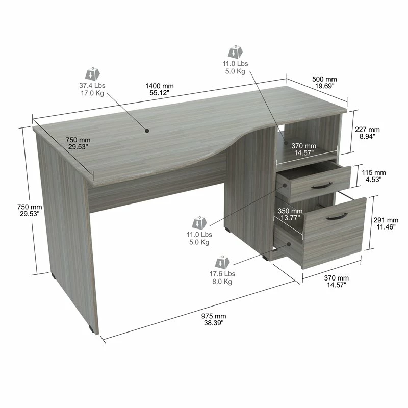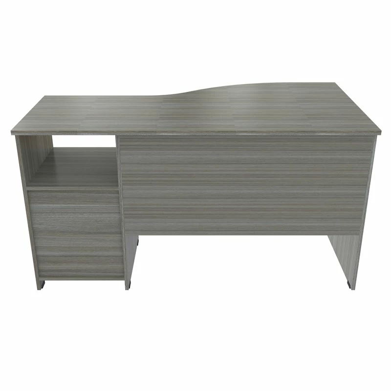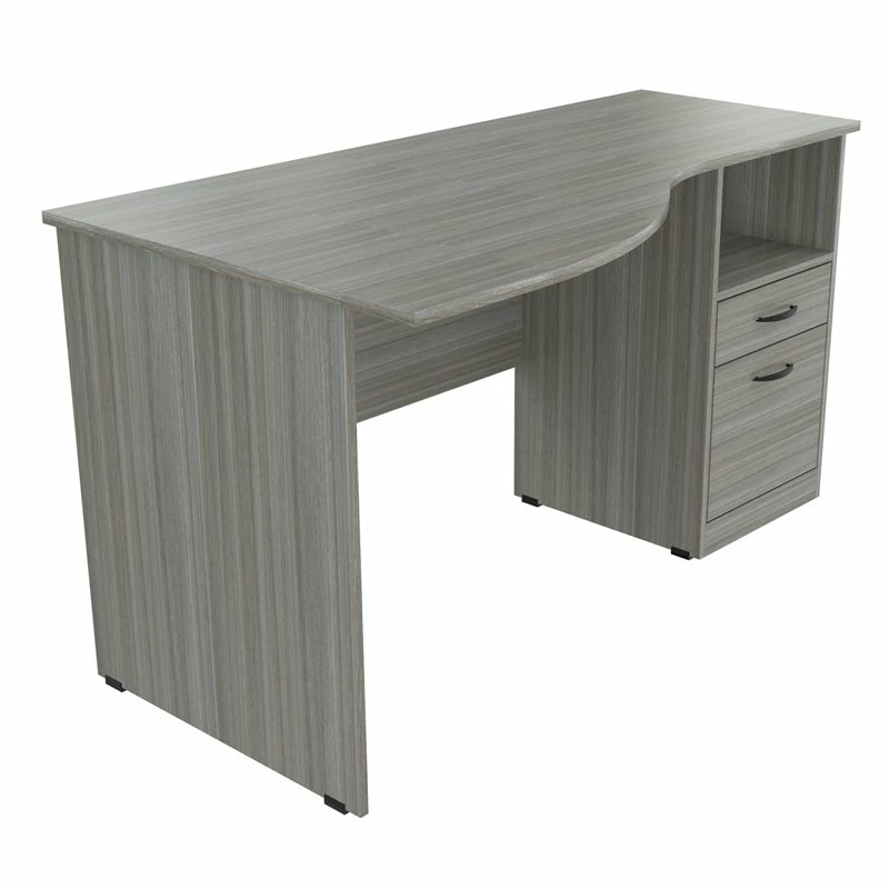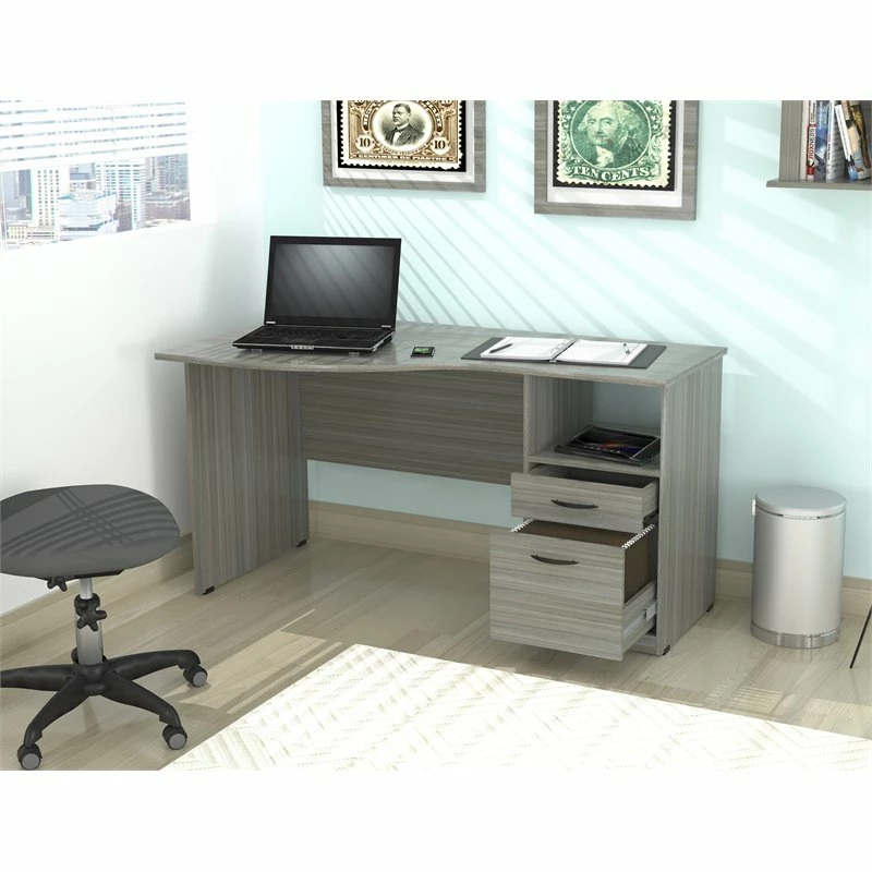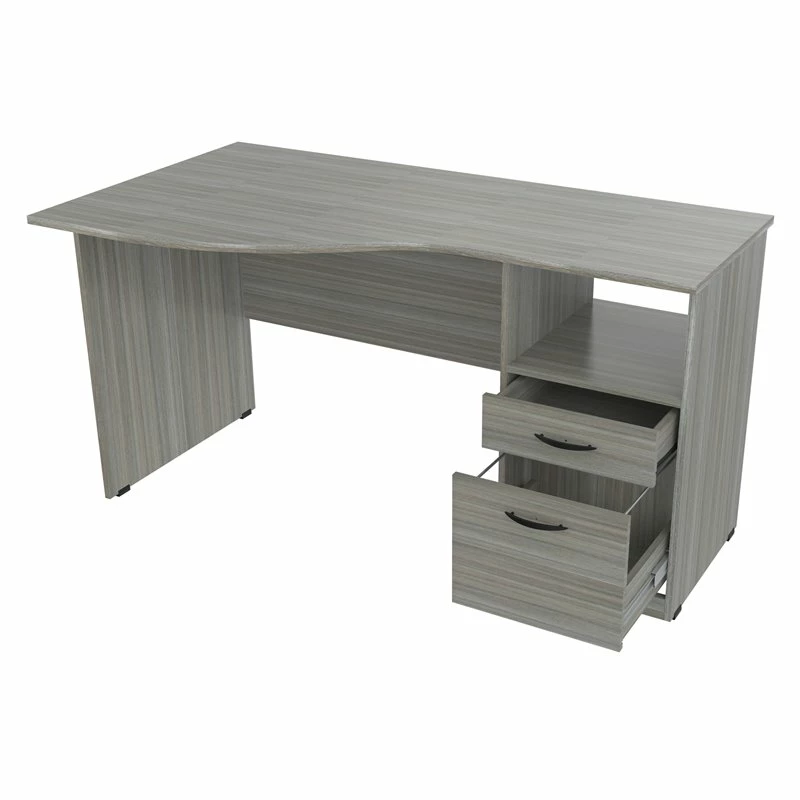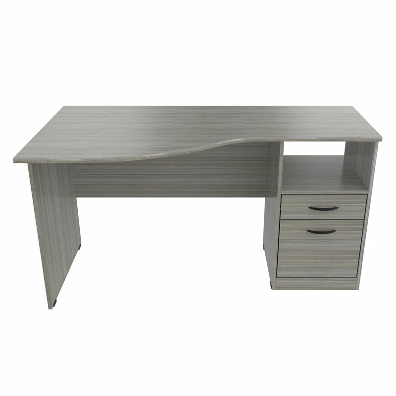 Curved Top Writing Desk by Inval® finished in a rich “Smoke Oak” laminate with durable melamine which is stain, heat and scratch resistant. It is constructed from manufactured wood. This desk features a large curved top providing a spacious work surface which will create a perfect addition to your home office or office. It includes a laminated modesty panel, open storage shelf, one accessory drawer with slides and one file drawer both with brushed metal handles. The file drawer has full extension metal drawer glides which accommodates letter sized files. Square plastic sliders protect the unit and allow for easy mobility when cleaning or rearranging your room décor. Assembly is required.