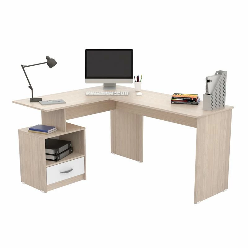 Merlin L Shaped Work Center by Inval® finished in a rich Maple-White laminates in durable melamine which is stain, heat and scratch resistant. Constructed from manufactured wood. With large dual desktops, you have an abundance of room on which to place your laptop, tablet, documents, office supplies and any other décor to add a personal touch. It has an open cubicle space and one (1) drawer. The desk is equipped with a cable management pass-through to keep all cords organized. The design without center obstacles makes it simple to move from side to side enabling you to work in an effortlessly manner. Both the laminates and design make it ideal for staging and decorating your home office or office.