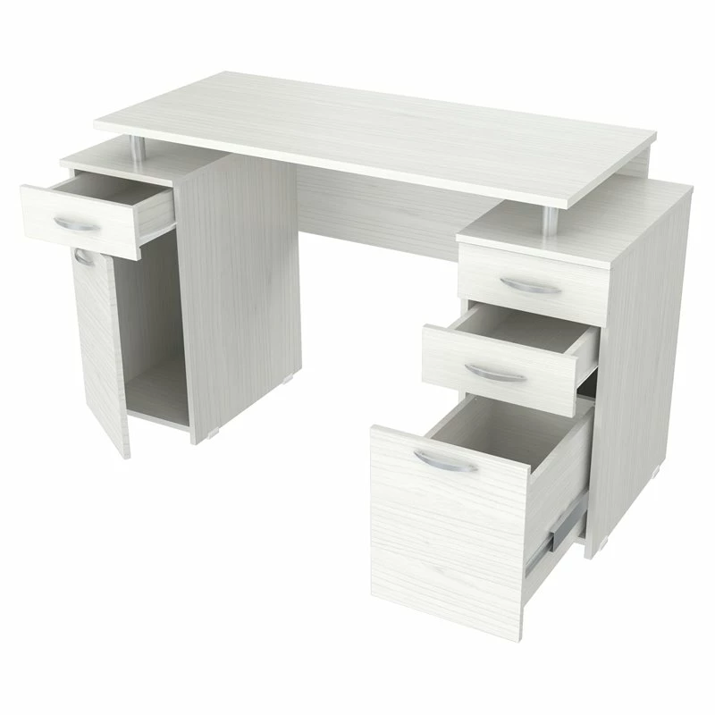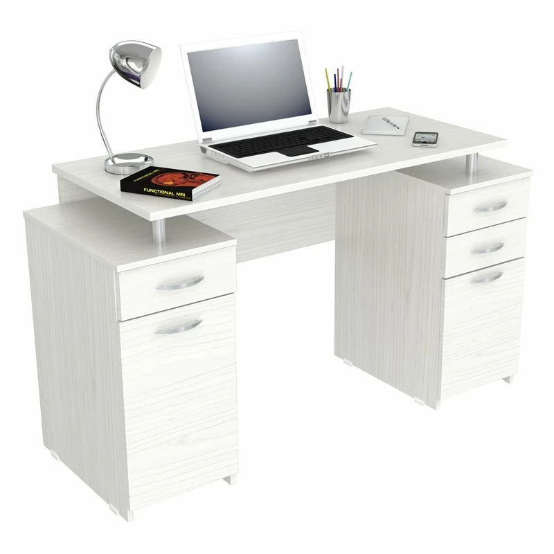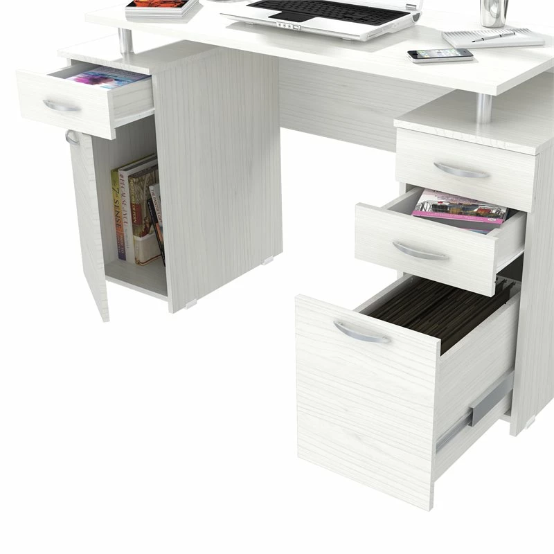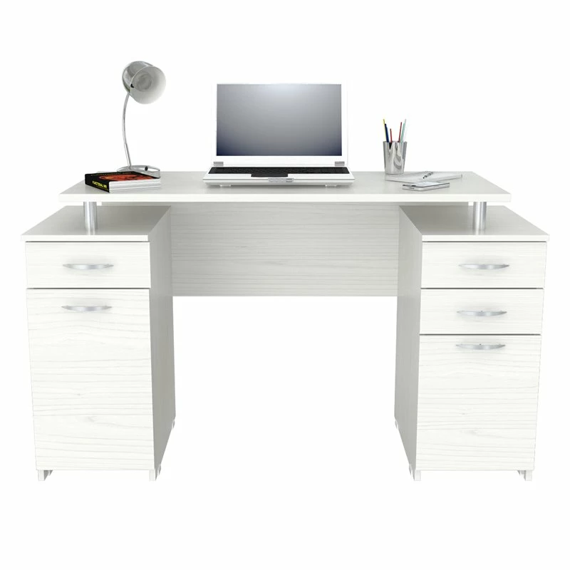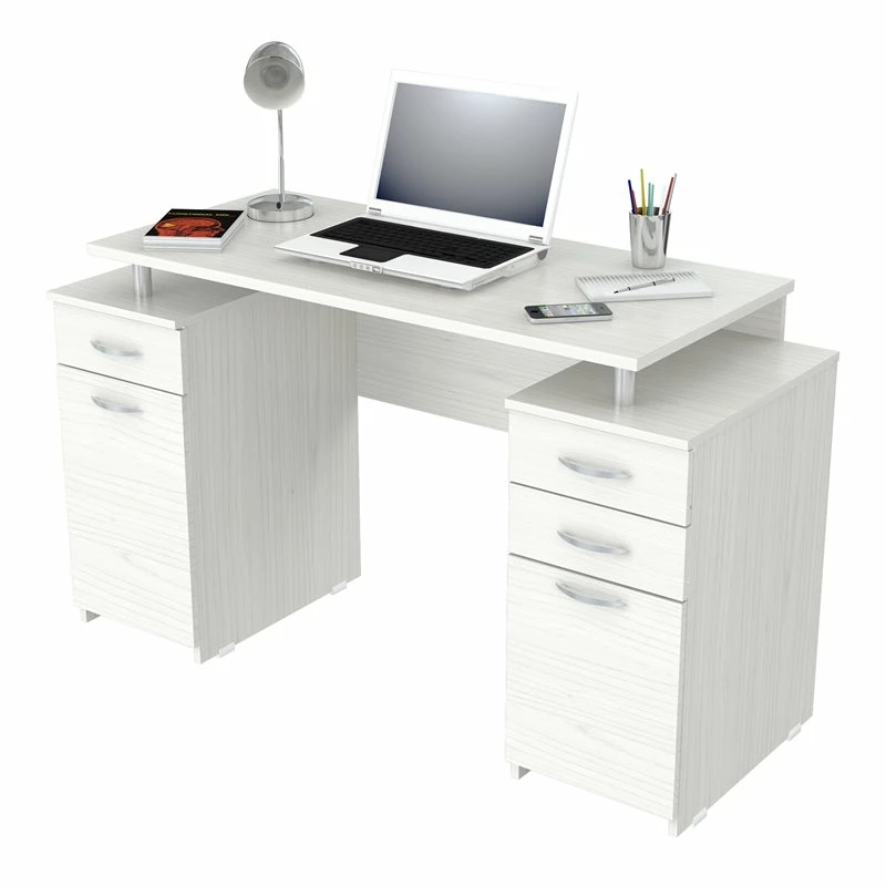 Writing Desk by Inval® finished in a rich “Washed Oak” laminate with durable melamine which is stain, heat and scratch resistant. It is constructed from manufactured wood. This unit offers a 1” thick work area positioned on top of chrome metal risers. It features 2mm edge banding as well as two pedestals for ample storage. One pedestal has two accessory drawers and one file drawer. The file drawer can accommodate both letter and legal sized files and has full extension metal drawer glides. The second pedestal has an additional accessory drawer and a storage compartment concealed by a door. Both drawers and door have brushed metal handles, and both pedestals include plastic base gliders to protect the unit when moving it. Assembly is required.