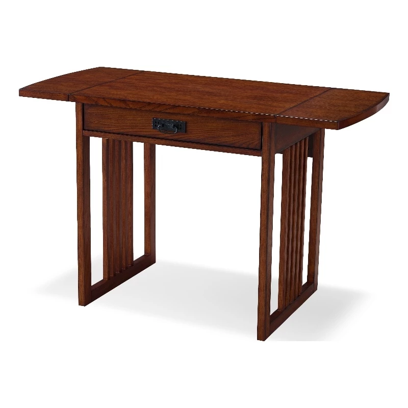 Perfect for laptops or to hide away papers or a desktop keyboard, this delicately scaled chocolate desk offers abundant organization assistance in just a tiny space. The drop down front presents the keyboard at a comfortable work height while full extension drawer guides offer the full depth of the drawer as useable space. Drop leaves are at the ready to extend for extra work surface when you need it.