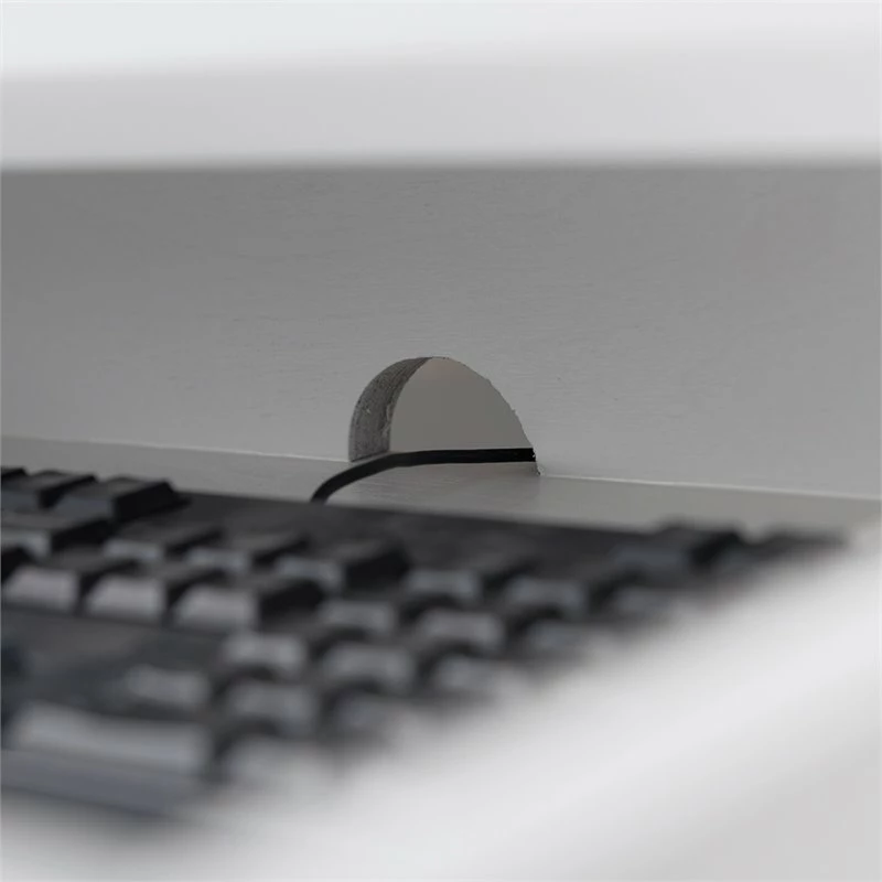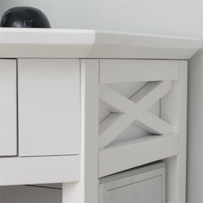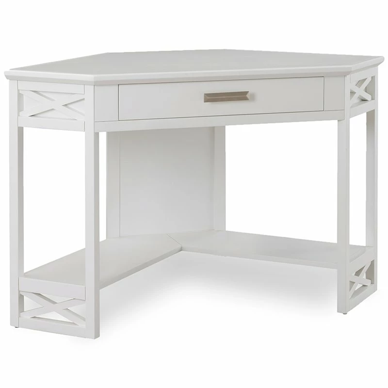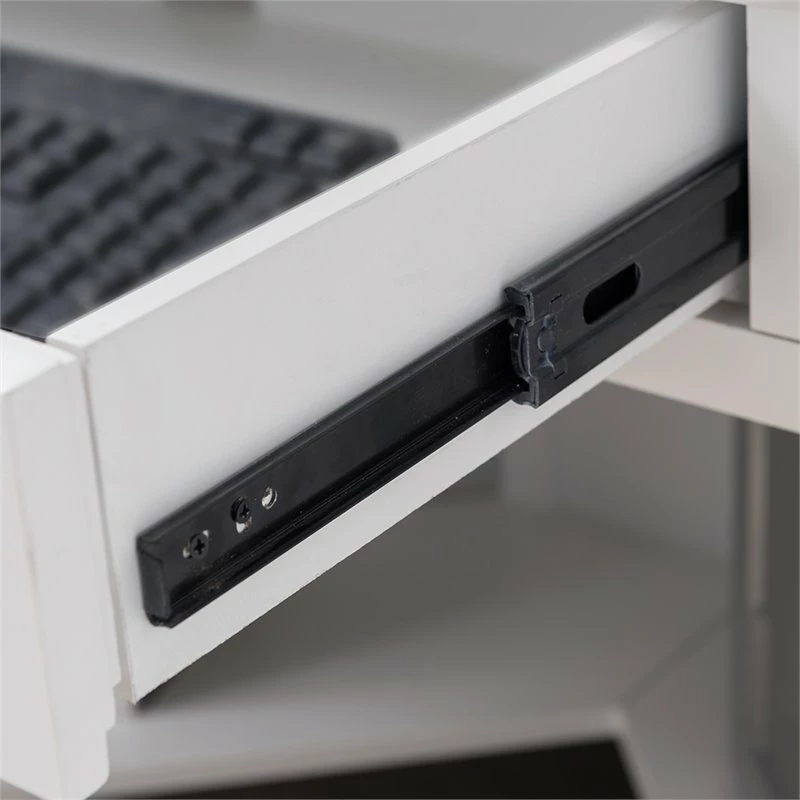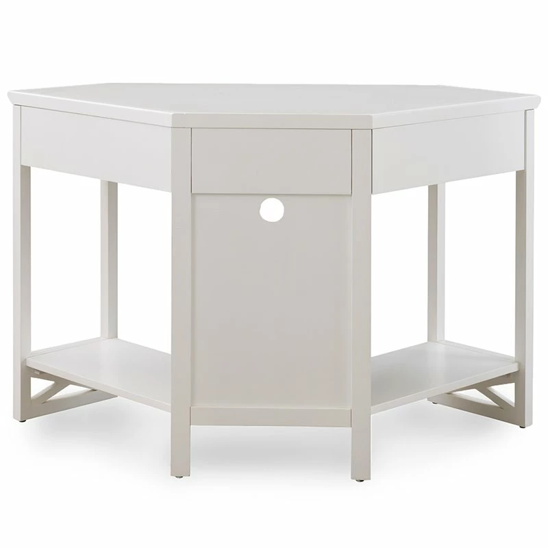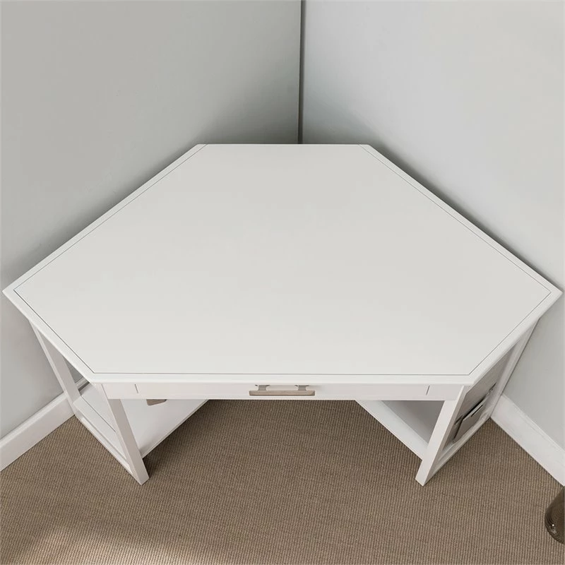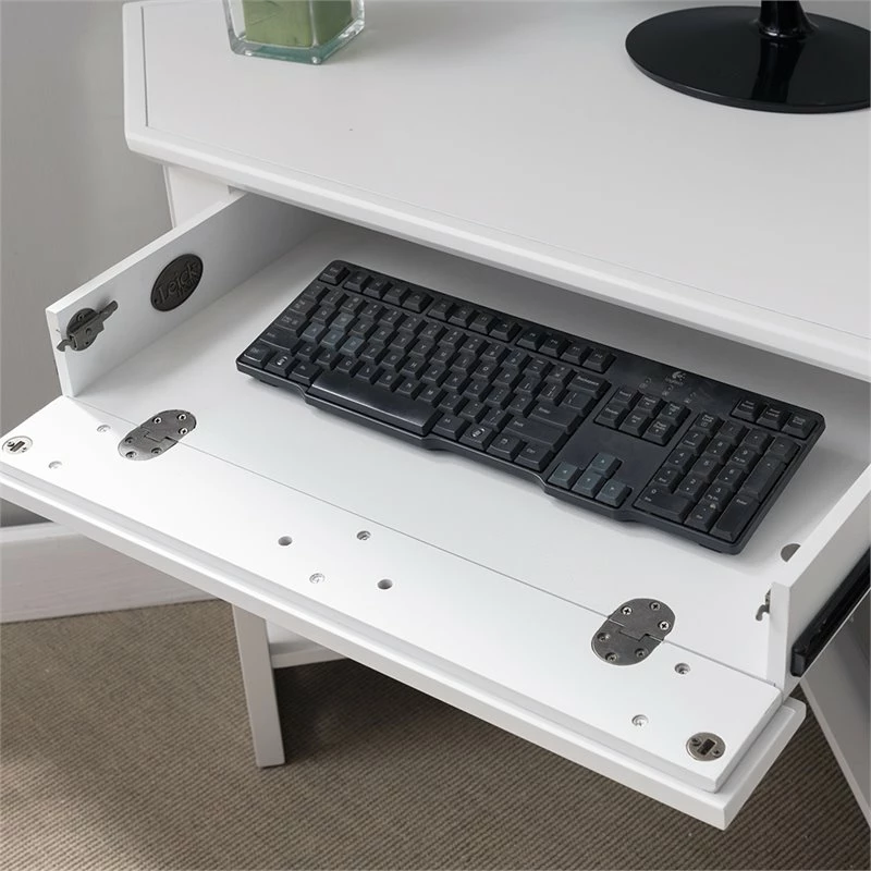 Sturdily built of solid hardwoods and veneers and finished in a painted white, this desk combines fashionable form with full function. Perfect for laptops or to hide away papers or a desktop keyboard, this efficiently scaled desk offers abundant organization assistance nestled into the corner of the room. The drop-down front hides the keyboard at a comfortable work height while full extension drawer guides offer the full depth of the drawer as useable space.