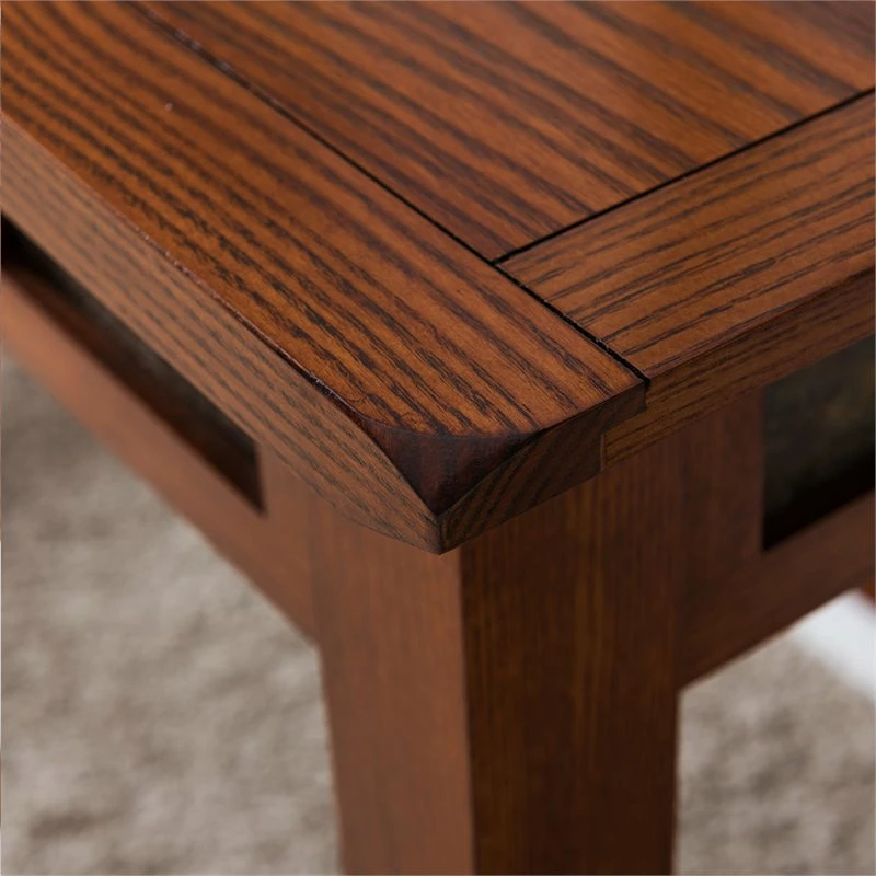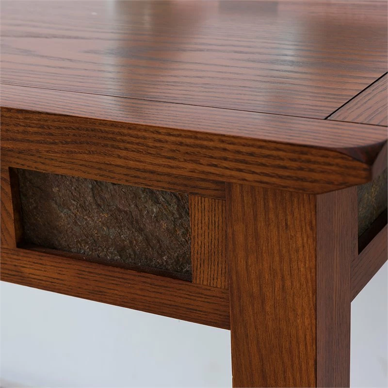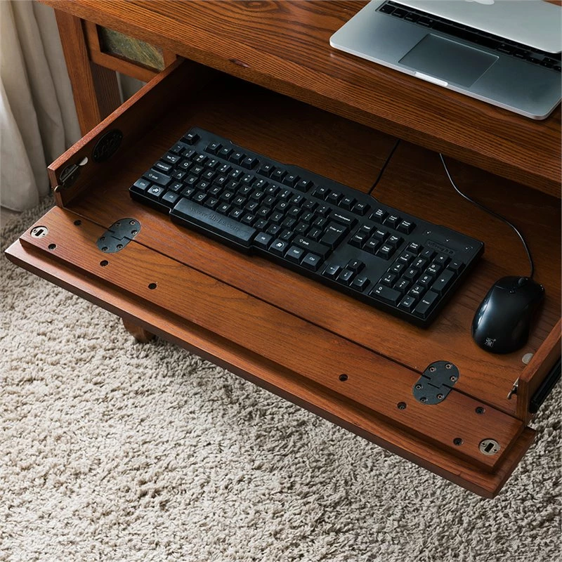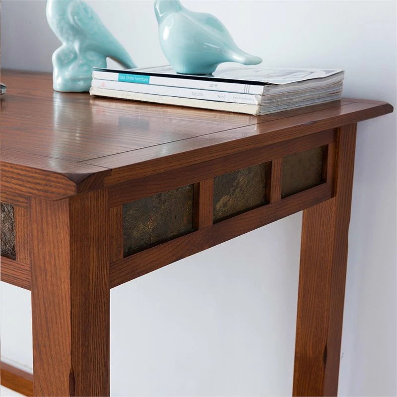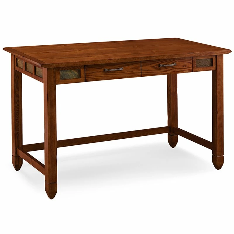 Perfect for laptops or to hide away papers or a desktop keyboard, this delicately scaled desk offers abundant organization assistance in just a tiny space. The drop down front presents the keyboard and mouse at a comfortable work height while full extension drawer guides offer the full depth of the drawer as useable space. Furniture details abound with natural slate tile details, under beveled solid wood top edges and hammered texture, pewter hardware.