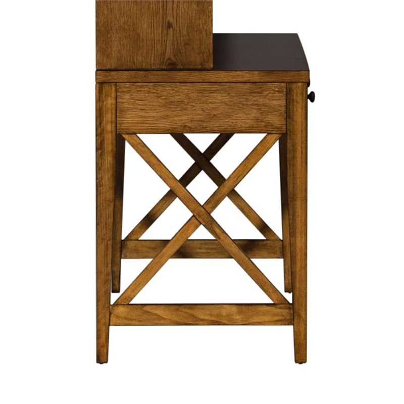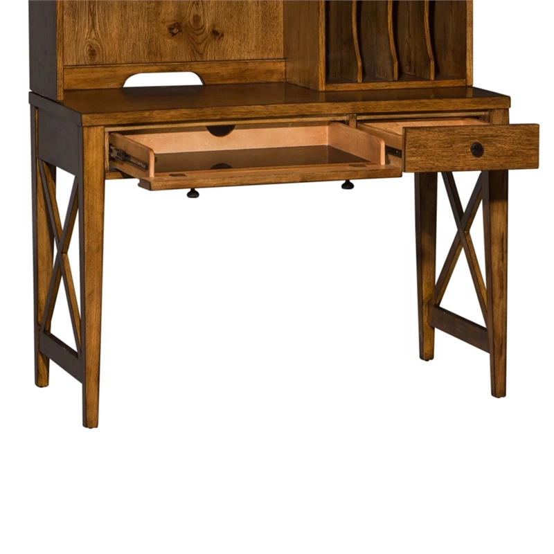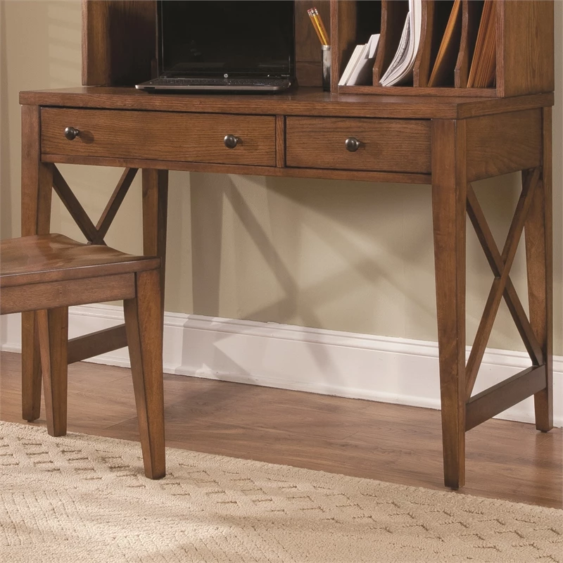 Work from home or the office in comfort and style with the Hearthstone Ridge writing desk. Crafted of rubberwood solids and oak veneers, this piece features a rustic oak finish and is accented with antique brass knob hardware. This desk has two full extension drawers including a flip down keyboard tray. The legs are tapered and have an X style slat accent. With vintage appeal, Hearthstone is a casual, rustic style that never goes out of fashion.