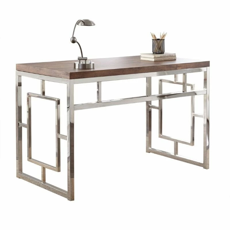 This collection features stunning designs in chrome that encompass modern, artsy styling. The desk top is constructed of faux wood Silvershield 3D Laminate, that resists heat, scratches and moisture. The chrome end panels seamlessly blend with the design of the bookcase. Matching bookcase is sold separately.