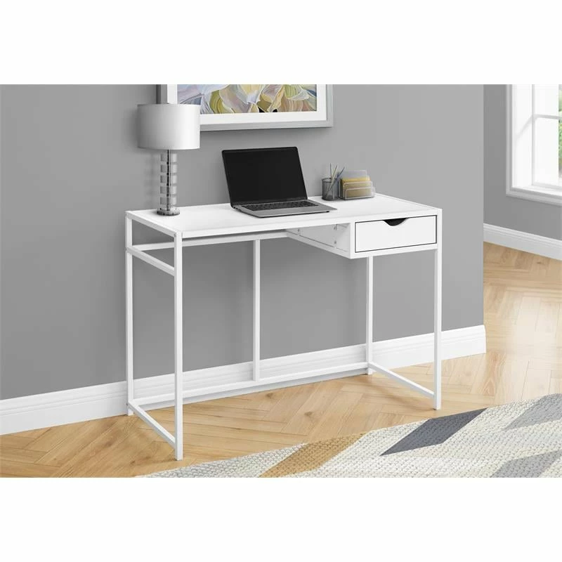 This computer desk with 1 storage drawer delivers stylish simplicity in a space-saving design. The desktop offers room for a laptop and the essentials you need to get work done. On the right, a storage drawer provides a convenient place to keep small supplies within easy reach. The drawer interior is finished in the same smooth, white laminate as the desktop panel and drawer exterior for a clean look. A slim yet sturdy metal frame in a white finish outlines the desktop and storage drawer for a modern-industrial touch. The streamlined style of this compact writing table makes it a great choice if your home office space is in a living room or bedroom.