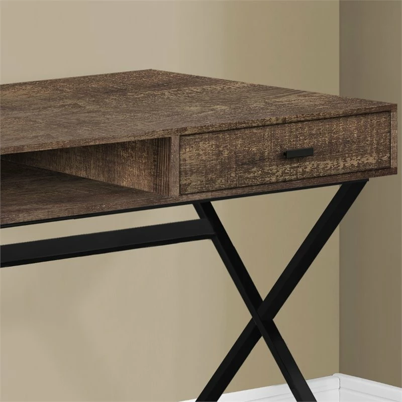 This modern desk in a chic brown reclaimed wood-look finish is the ideal computer workstation for your home office. The stylish criss-cross black metal legs provide sturdy support while the brown reclaimed wood-look top adds style. This practical yet fashionable desk offers ample surface room, 2 storage drawers with black handle and one open concept shelf perfect for storing away your laptop and other accessories.