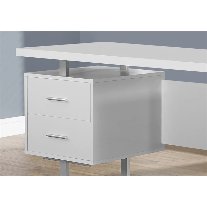 Feel like a boss in your home office when you sit down to work at this mid-size computer desk with 3 storage drawers. The thick-panel floating desktop provides generous room for a laptop and writing materials, and allows you to use the tops of the drawer units as extra surfaces. Finished in the same white laminate as the desktop, 2 small drawers and 1 large drawer with a bar for hanging files offer space for items you want to keep off the work surface. For flexibility, the drawer units are reversible and can be installed on either side according to your preference. Supporting the desk are metal legs in a silver finish with a modern stylish U shape.