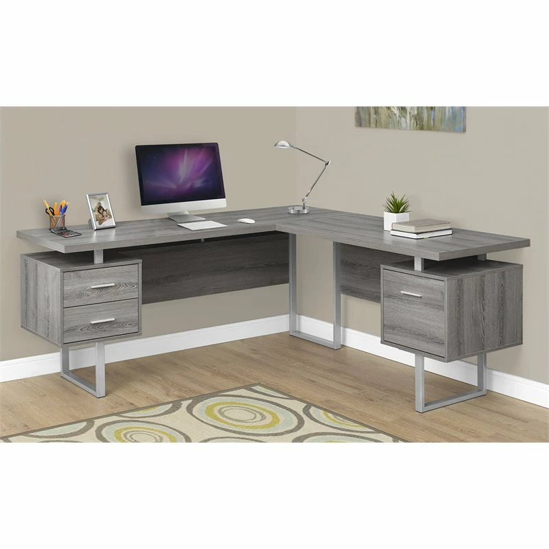 Contemporary extra-long L shaped corner computer desk finished in a dark taupe reclaimed look with silver metal legs, can be assembled on the left or right hand side. It features thick floating tops with 2 storage drawers and file drawer. This Monarch L Modern Wood Gray Shaped Corner Computer Desk will undoubtedly be a great addition to your home décor.