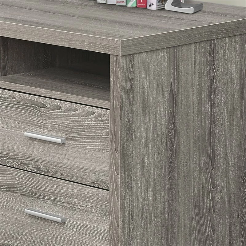 This modern style dark taupe reclaimed-look L shaped corner computer desk can conveniently be configured on the left or right hand side. Featuring a storage drawer, file drawer, and an open shelf to conveniently store documents.