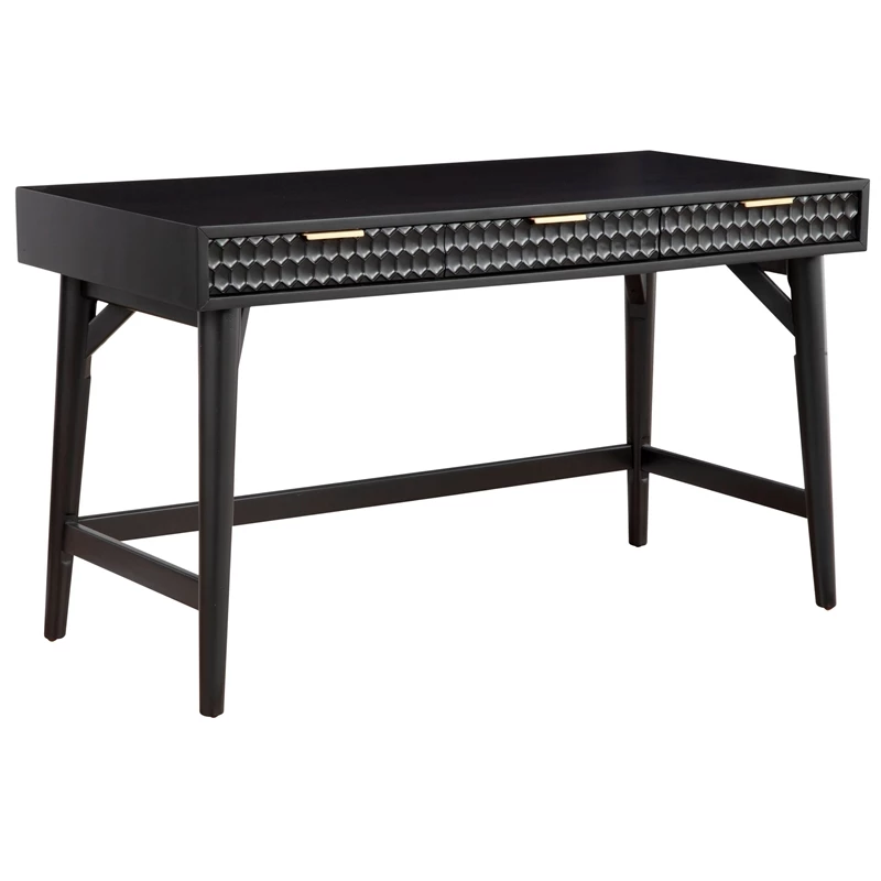 Contemporary fashion, the Origins by Alpine Black Pearl Wood Desk combines clean lines with multiple materials. The textured drawer fronts are great looking, bordered by Mahogany solids and veneers, in a traditional black finish that makes decorating easy. The piece is accented by gold metal drawer handles and a all black base. There is ample storage with the 3 drawers. Coordinates with other pieces from the Black Pearl collection.