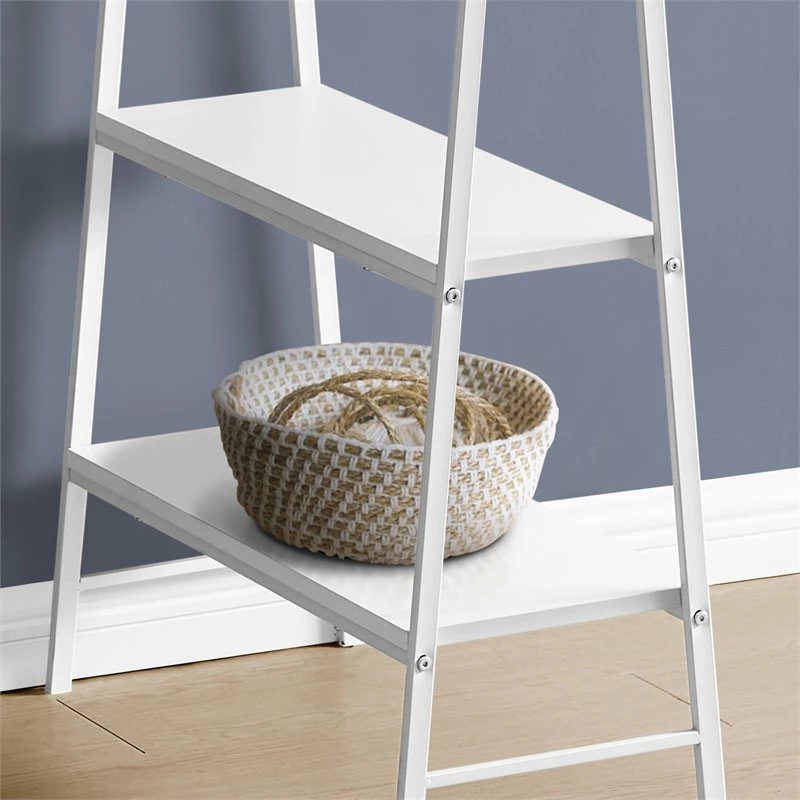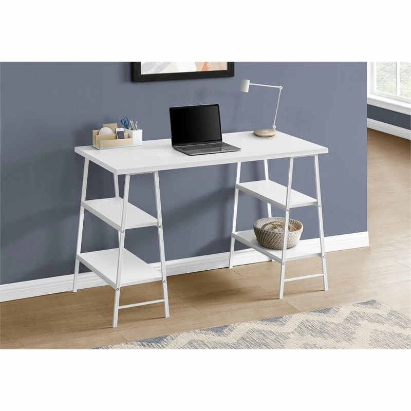 Make your computer desk work as hard as you do. This desk delivers style and functionality from top to bottom, starting with its thick and spacious desktop in a smooth, white finish. Sawhorse-style legs in white metal are put to work as supports for 4 open shelves that can be used to display books, small storage boxes, or other items. The unique, compact design of this industrial-style writing desk maximizes space and storage potential so that you can maximize productivity.
