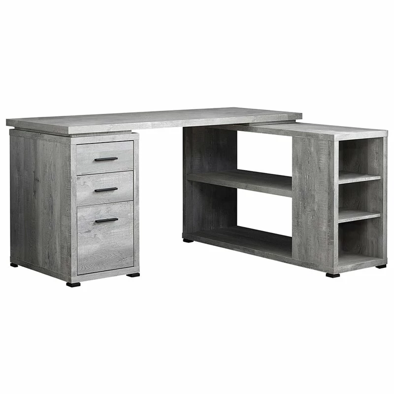 The trendy and industrial look of this L shaped computer desk will be the focal point in your modern home office. This simple and stylish desk features thick panels and clean lines in a modern gray reclaimed wood-look. The desk portion offers a spacious work surface that is great for doing paperwork or working on your computer. It also features 2 medium storage drawers and a convenient lateral file drawer on metal glides to help keep you organized. The secondary surface can be assembled on the left or right-hand side of the desk and offers additional workspace with adjustable shelves. The black handles and feet boldly accent this L-shaped desk making it a must-have for any home or office space.