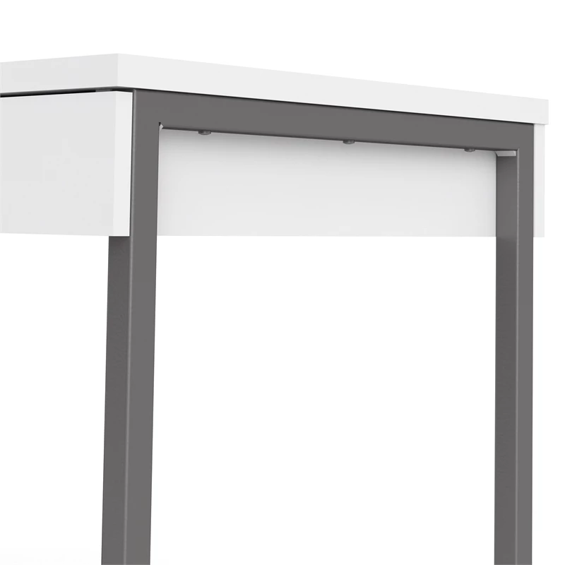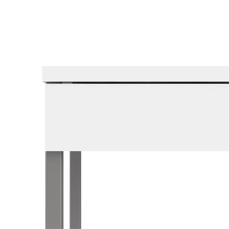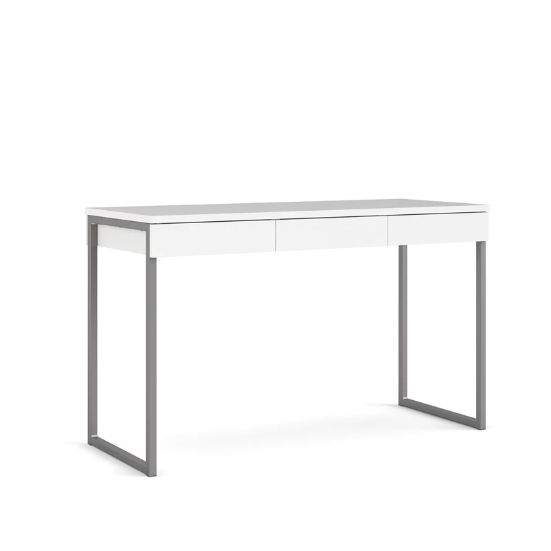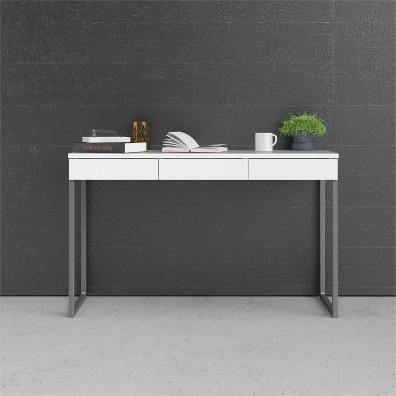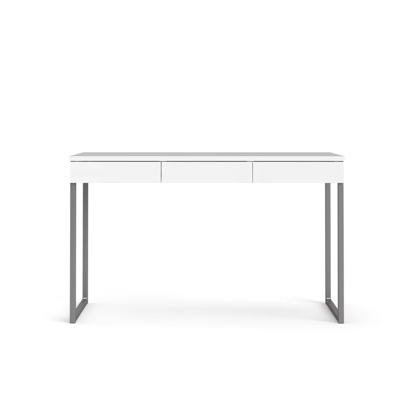 The Pemberly Row 3 Drawer Computer Desk provides a modern addition to the home office. This sleek, modern desk is made of MDR Composite, which holds more effectively than most all-wood furniture because it stands up better to heat and humidity over time. This desk has a smooth white finish and has enough space to hold your desktop or laptop and writing materials. The legs are finished in a shiny silver finish. There are 3 drawers underneath that help de-clutter your space and holds documents, writing utensils and paper clips—anything you need to get the job done.