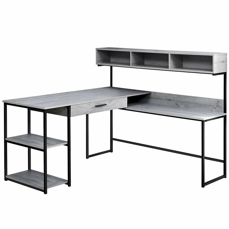 Let this L shaped corner desk / workstation inspire you with its practical and modern industrial aesthetic. It starts with a smooth laminate finish on all sides in a chic gray wood-grain finish accented with strong black metal framing. The numerous storage options include a wide drawer on metal glides with a sturdy black plastic handle alongside an open cubby, and 2 fixed bottom shelves for books, magazines or even a small printer. The side station is so useful with 3 spacious cubbies on top for all your work essentials. Side station is not reversible.