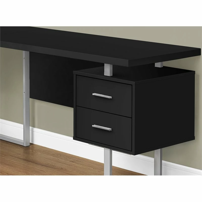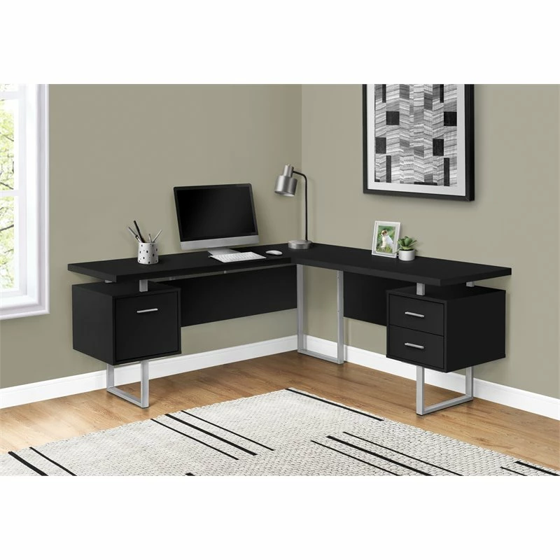 Give your home office a promotion with this extra-large, corner computer desk with 3 storage drawers. The thick-panel, L-shaped floating desktop provides plenty of room for you to spread out everything you need to be productive and allows you to use the tops of the drawer units as extra surfaces. Finished in the same black laminate as the desktop, 2 small drawers and 1 large drawer with a bar for hanging files offer space for items you want to keep off the work surface. For flexibility, the drawer units are reversible and can be installed on either side according to your preference. Supporting the desk are metal legs in a silver finish with a modern, stylish U shape.