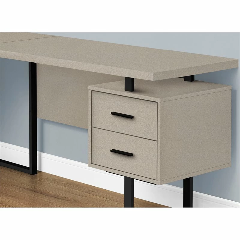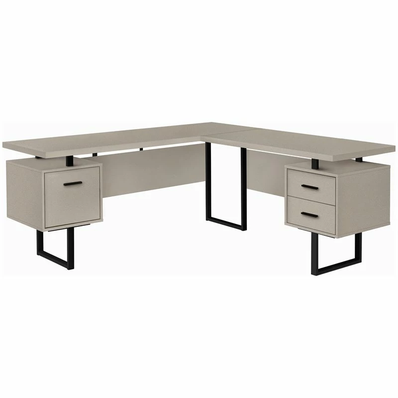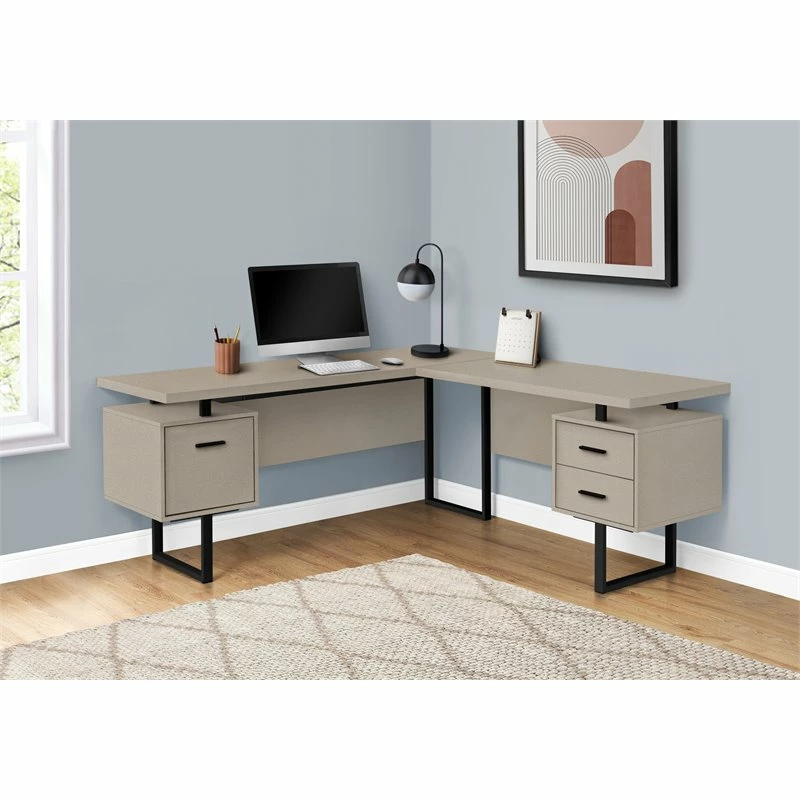 Give your home office a promotion with this extra-large, corner computer desk with 3 storage drawers. The thick-panel, L-shaped floating desktop provides plenty of room for you to spread out everything you need to be productive and allows you to use the tops of the drawer units as extra surfaces. Finished in the same modern taupe laminate as the desktop, 2 small drawers and 1 large drawer with a bar for hanging files offer space for items you want to keep off the work surface. For flexibility, the drawer units are reversible and can be installed on either side according to your preference. Supporting the desk are metal legs in a black finish with a modern, stylish U shape.