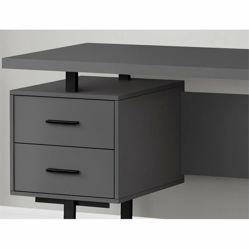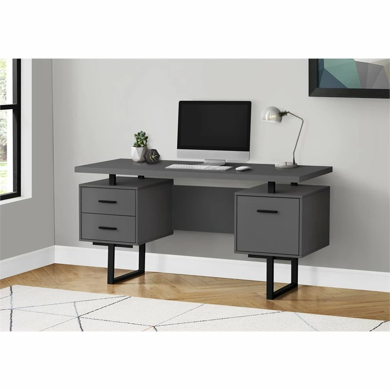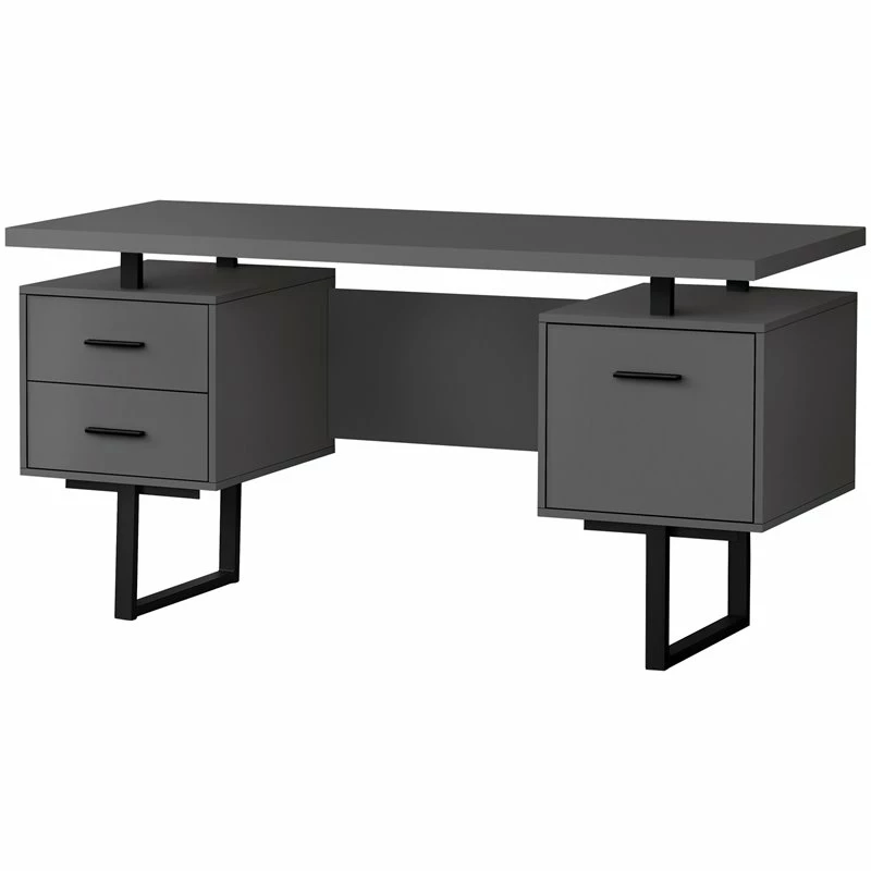 Feel like a boss in your home office when you sit down to work at this mid-size computer desk with 3 storage drawers. The thick-panel floating desktop provides generous room for a laptop and writing materials, and allows you to use the tops of the drawer units as extra surfaces. Finished in the same modern grey laminate as the desktop, 2 small drawers and 1 large drawer with a bar for hanging files offer space for items you want to keep off the work surface. For flexibility, the drawer units are reversible and can be installed on either side according to your preference. Supporting the desk are metal legs in a black finish with a modern, stylish U shape.