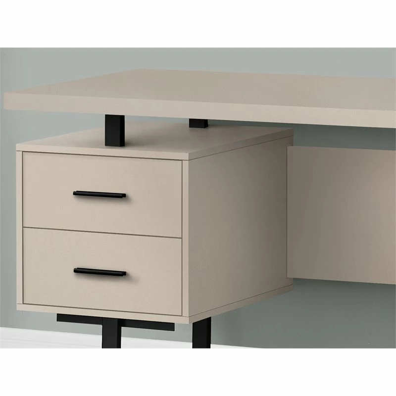 Feel like a boss in your home office when you sit down to work at this mid-size computer desk with 3 storage drawers. The thick-panel floating desktop provides generous room for a laptop and writing materials, and allows you to use the tops of the drawer units as extra surfaces. Finished in the same modern taupe laminate as the desktop, 2 small drawers and 1 large drawer with a bar for hanging files offer space for items you want to keep off the work surface. For flexibility, the drawer units are reversible and can be installed on either side according to your preference. Supporting the desk are metal legs in a black finish with a modern, stylish U shape.