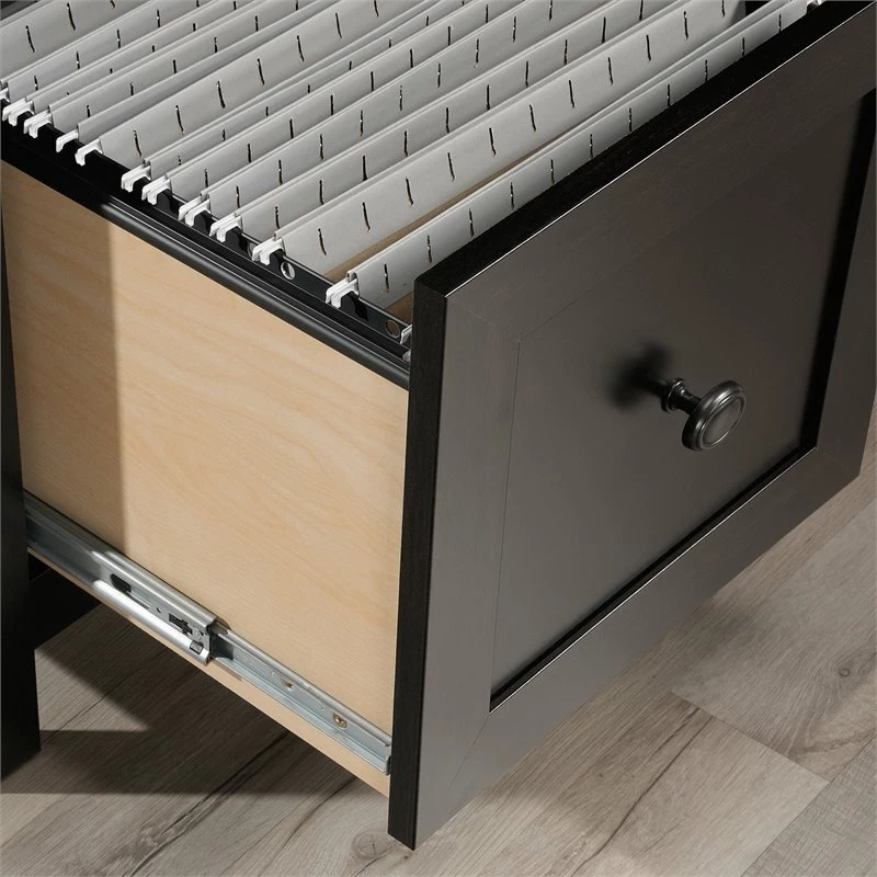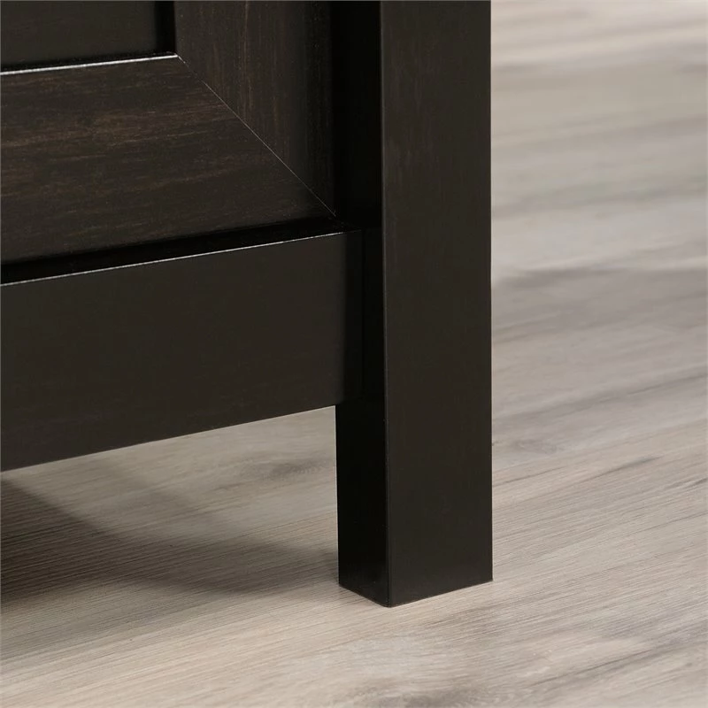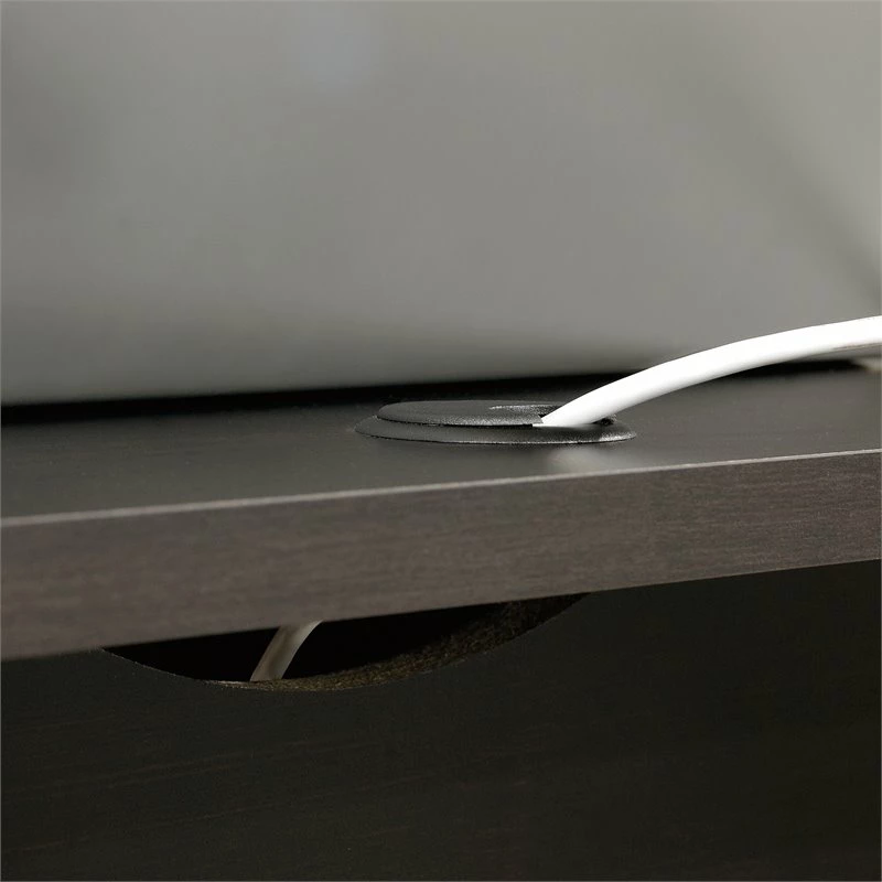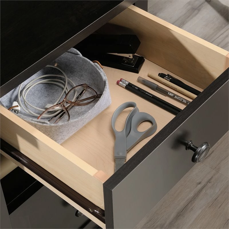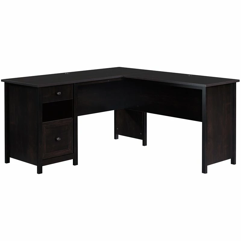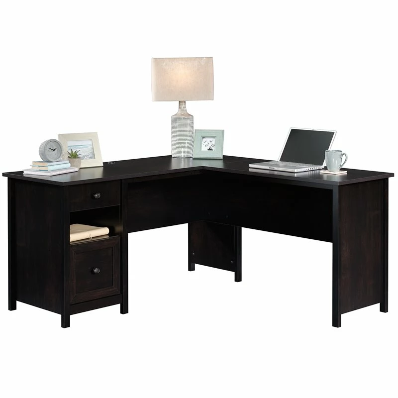 A home desk is used for more than just work from home activities—making grocery lists, art projects, and more all happen at a home desk. Do all these undertakings and more, with the stylish and functional L-shaped desk from Pemberly Row. A spacious top surface accommodates a computer, binders, and photos of your loved ones—this home office desk has room for it all! This L-shaped computer desk includes a file drawer with full extension slides that holds letter-size hanging files to keep your documents organized. To store your pens, stapler and notecards, this desk with file drawer includes a smaller drawer with metal runners and safety stops. An open shelf for additional storage allows you to display items like books, home décor, or other trinkets. This small office desk is finished on all sides so it will look polished no matter how you arrange it in your home. A cord management system with two desktop grommets keeps your workspace free of cord clutter. Finally, a quick and easy assembly process aided by patented T-slot drawer system and patented slide-on molding allows you to assemble your new L-shaped desk in a breeze. Finished in Estate Black ®, this L-shaped home office desk adds the right amount of space and style to any home office.