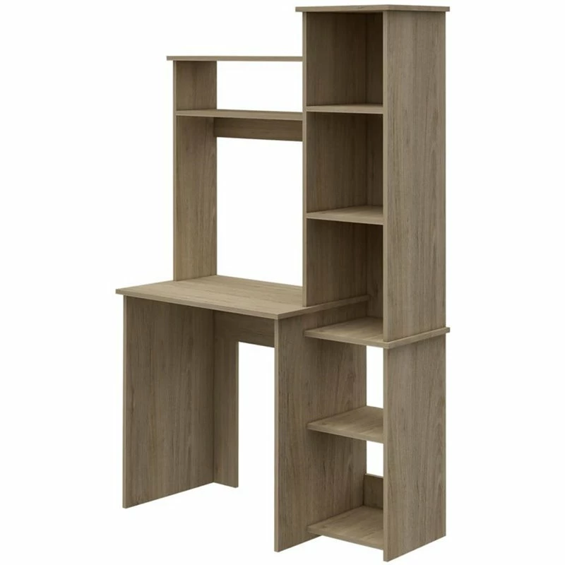 A stacked silhouette joins varying sizes and shapes of storage spaces that add function to a Desk perfect for a compact space. Dress up a dorm room or corner with this Desk with hutch, taking full advantage of seemingly endless places to display books and office supplies. Constructed of charming composite wood in your choice of finishes, this Desk offers a suitably sized writing space and an open hutch attachment.
