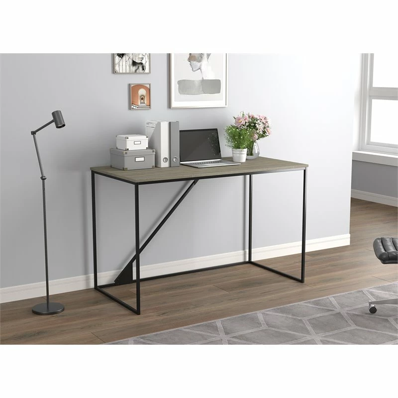 This desk brings a contemporary, minimalistic and industrial feel to your home office. It has a wrought iron frame and a spacious work surface. The desk provides a comfortable working environment that promotes productivity.