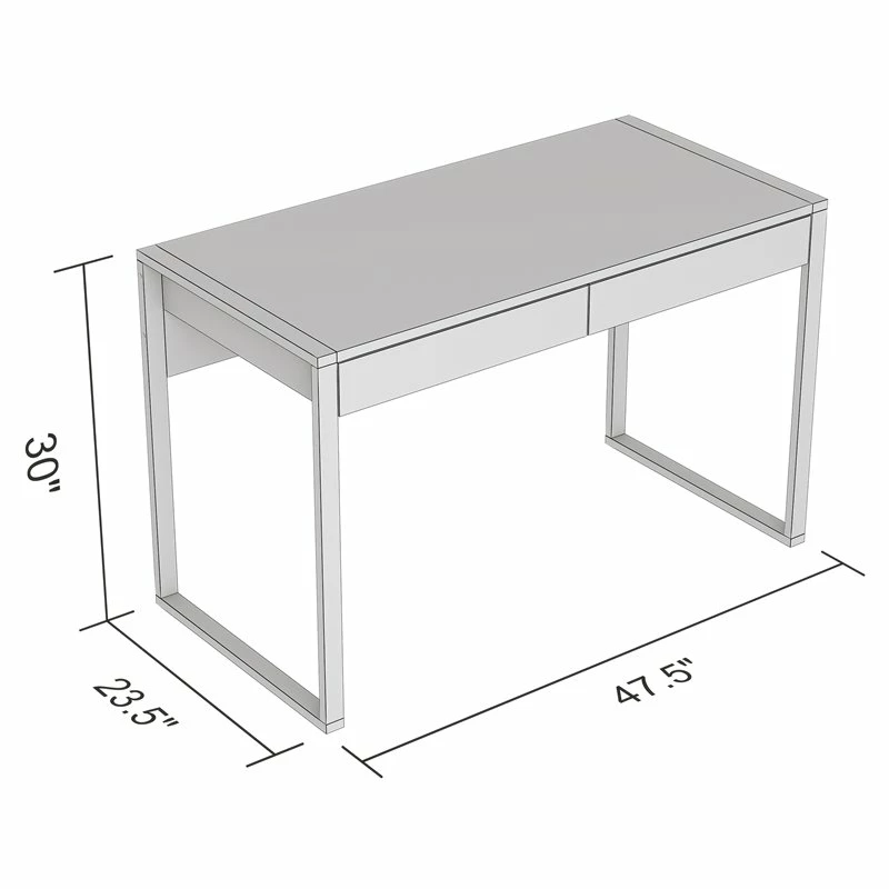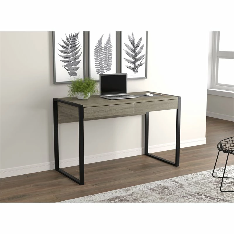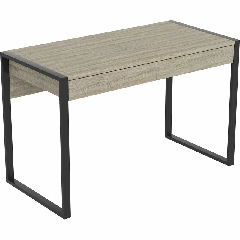 Trendy and modern, this computer desk is the perfect combination of function, durability, and design in a stylish form. With clean lines and sturdy black metal legs, this desk will add a sophisticated industrial/modern touch to any office. Featuring 2 storage drawers to help keep you organized, with a large desktop surface to provide plenty of room for all your hardware and working needs.