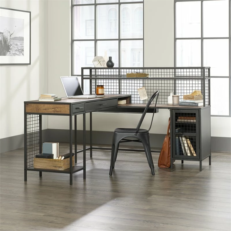 It’s time for a style upgrade. Get motivated to take on all your major projects with the charming good looks and industrial-inspired design of this L-shaped desk from the Boulevard Café collection. Its spacious workspace provides you with all the room you need for your must-have desk essentials like your laptop, collection of notepads and your hot cup of coffee. It features two drawers with full extension slides for easy access storage for items like pencils and pens. Behind its metal door featuring a wire mesh front is a storage area that includes an adjustable shelf that can be moved to different heights to create flexible storage for items of all shapes and sizes. If that isn’t enough, it also features elevated shelving for additional storage options or a display area for your favorite décor items. It is finished on all sides so it will look great no matter where it stands. It’s durable, powdercoated metal frame gives it its industrial beauty and sturdy stature that is built to last. Finished in Vintage Oak with black accents, this stunning desk will have you ready to take on the day.